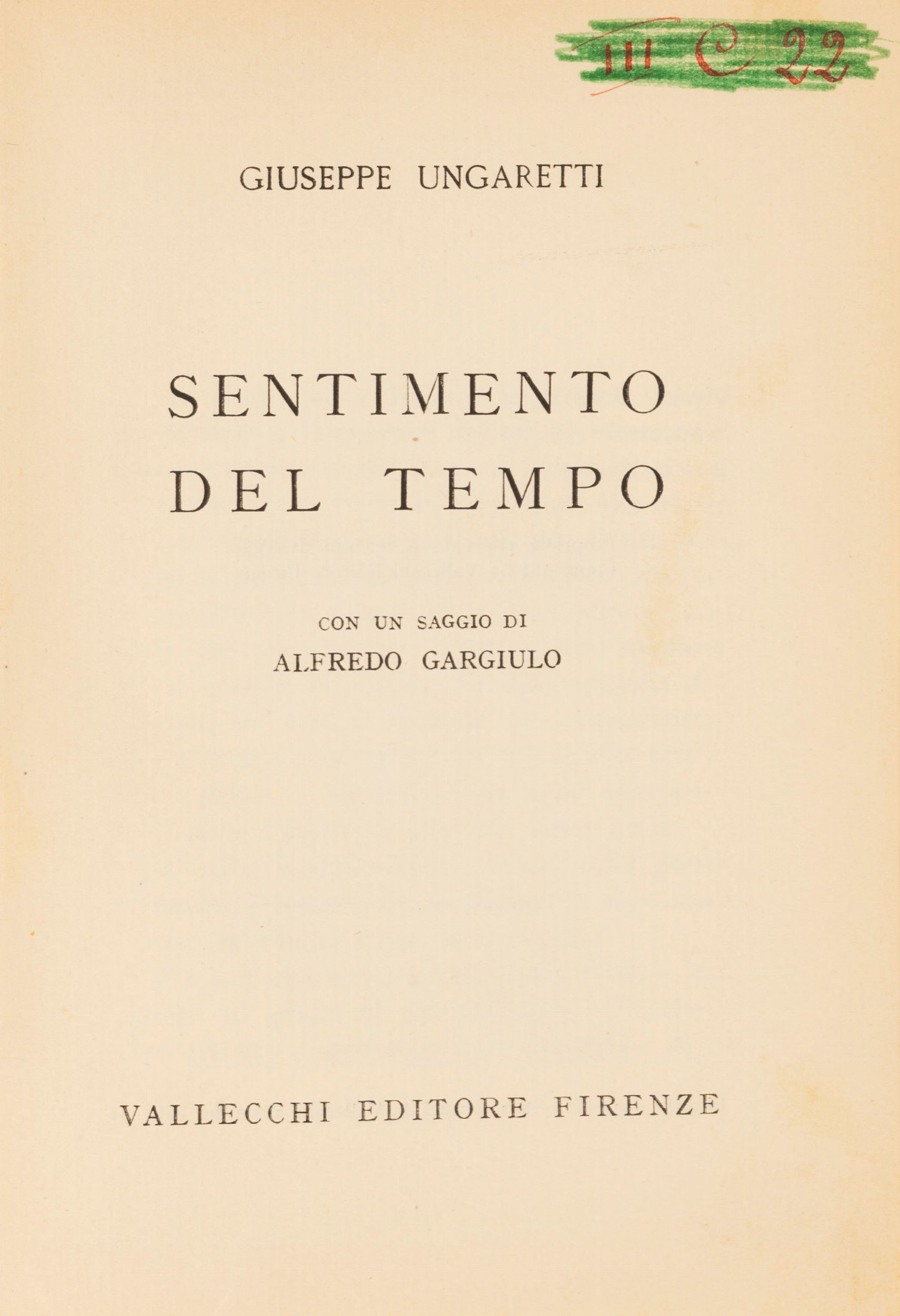 1933 Firenze, Stabilimenti Grafici A. Vallecchi, 1933. In 8° piccolo. Brossura editoriale con tassello di biblioteca, timbro di appartenenza nel foglio di guardia della copertina anteriore, sigla di collocazione al frontespizio cancellata. Segni di nastro adesivo, qualche sporadica arrossatura.