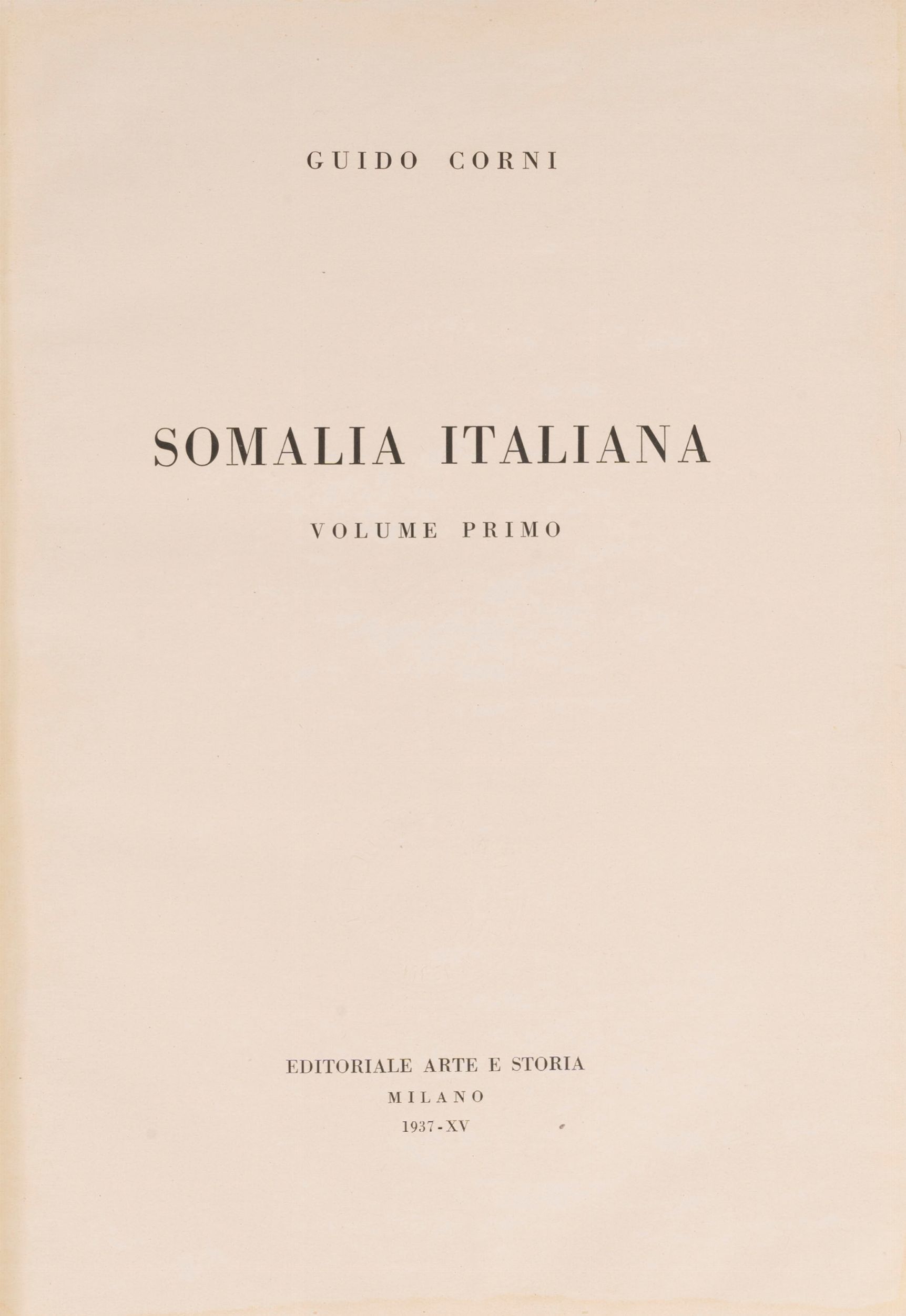 1937 Milano, Editoriale Arte e Storia, 1937. In 8°. 2 voll. Con numerose riproduzioni di fotografie, quadri, cartine geografiche, xilografie, legature editoriali in tela bordeaux, ai piatti stemma della Somalia Italiana in oro e triple cornici a secco, ai dorsi titoli e filetti in oro, tagli superiori rossi, lievi difetti.