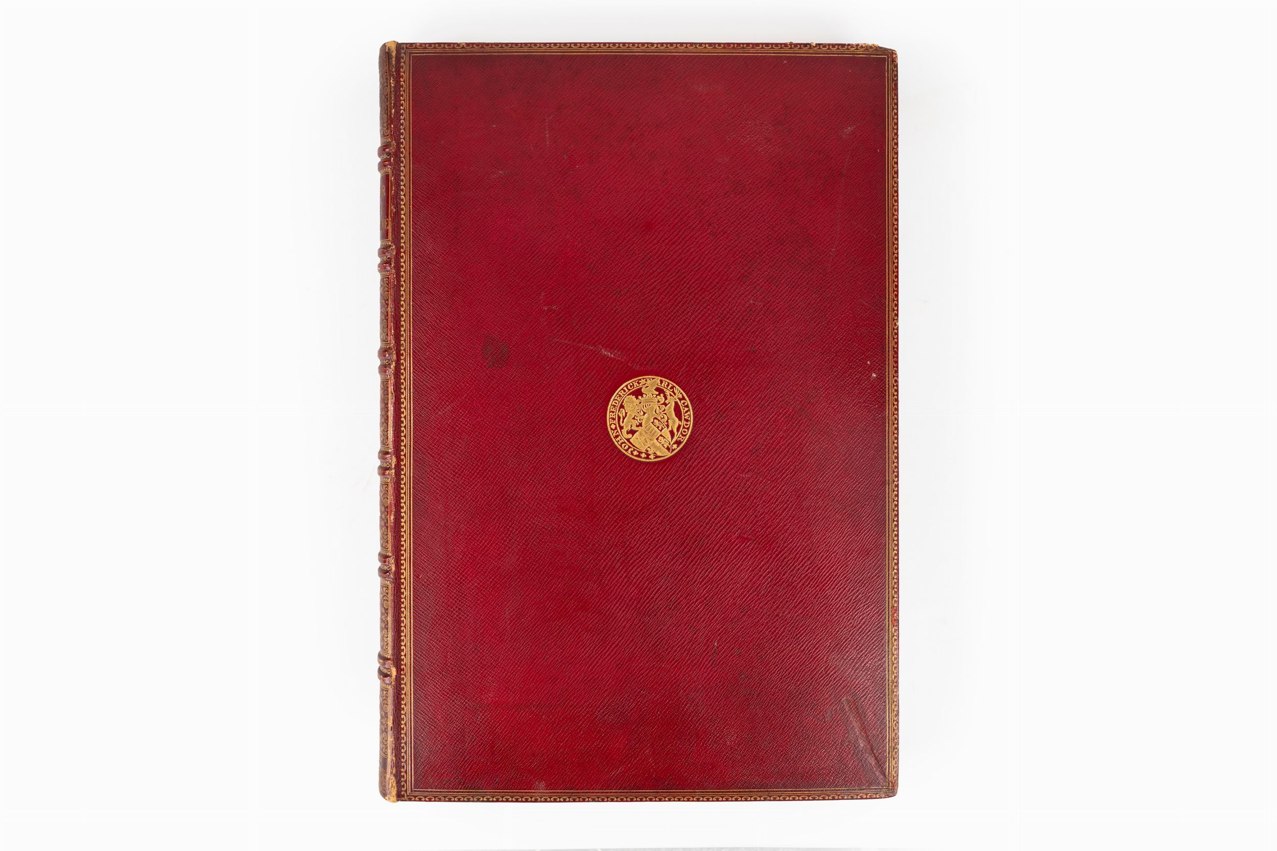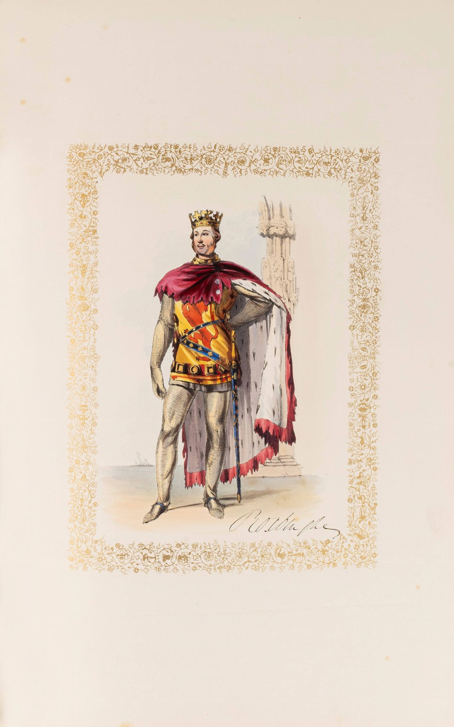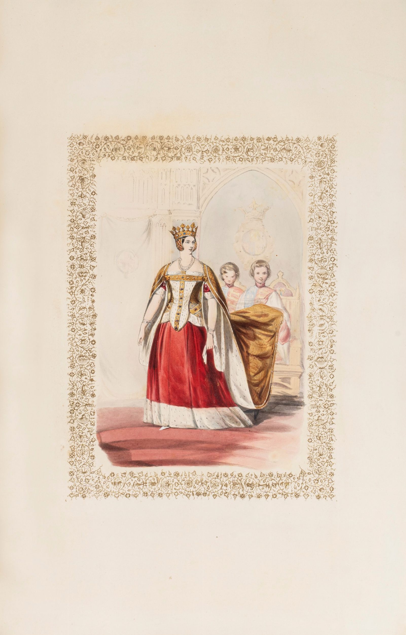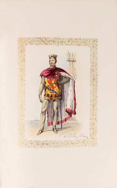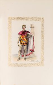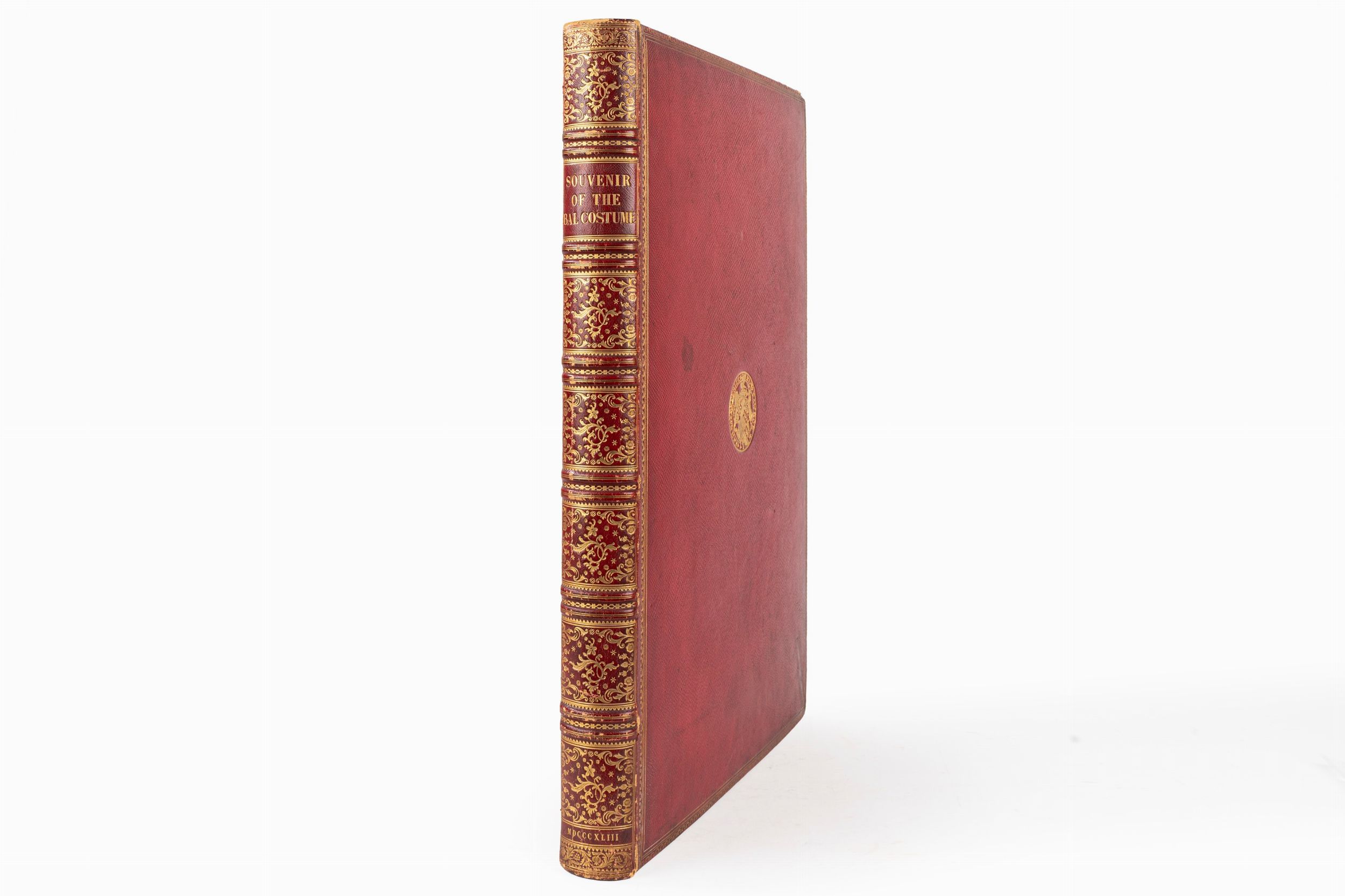 1843 London, P. and D. Colnaghi, 1843. In 2°, 550 x 375 mm. Con 56 stampe litografiche di personaggi in costume colorate a mano , di cui 54 che raffigurano i personaggi principali e 2 tavole aggiuntive che rappresentano studi variati del principe Alberto e della duchessa di Buccleuch, le figure sono stampate entro bordi decorati in oro, foglio di dedica alla Regina Vittoria cromolitografato, firmato “H. Johnston fecit' e stampato a colori da C. Graf, testo stampato in inchiostro blu, le tavole sono accompagnate da fogli di guardia bianchi e da fogli di carattere descrittivo, SPLENDIDA LEGATURA IN MAROCCHINO ROSSO A GRANA LUNGA , con impresso sui piatti lo stemma in oro di John Frederick Earl Cawdor (8 November 1790 – 7 November 1860), cornici in oro ai piatti, dorso in sette comparti con raffinate decorazioni in oro e titolo, qualche lieve abrasione e spellatura.