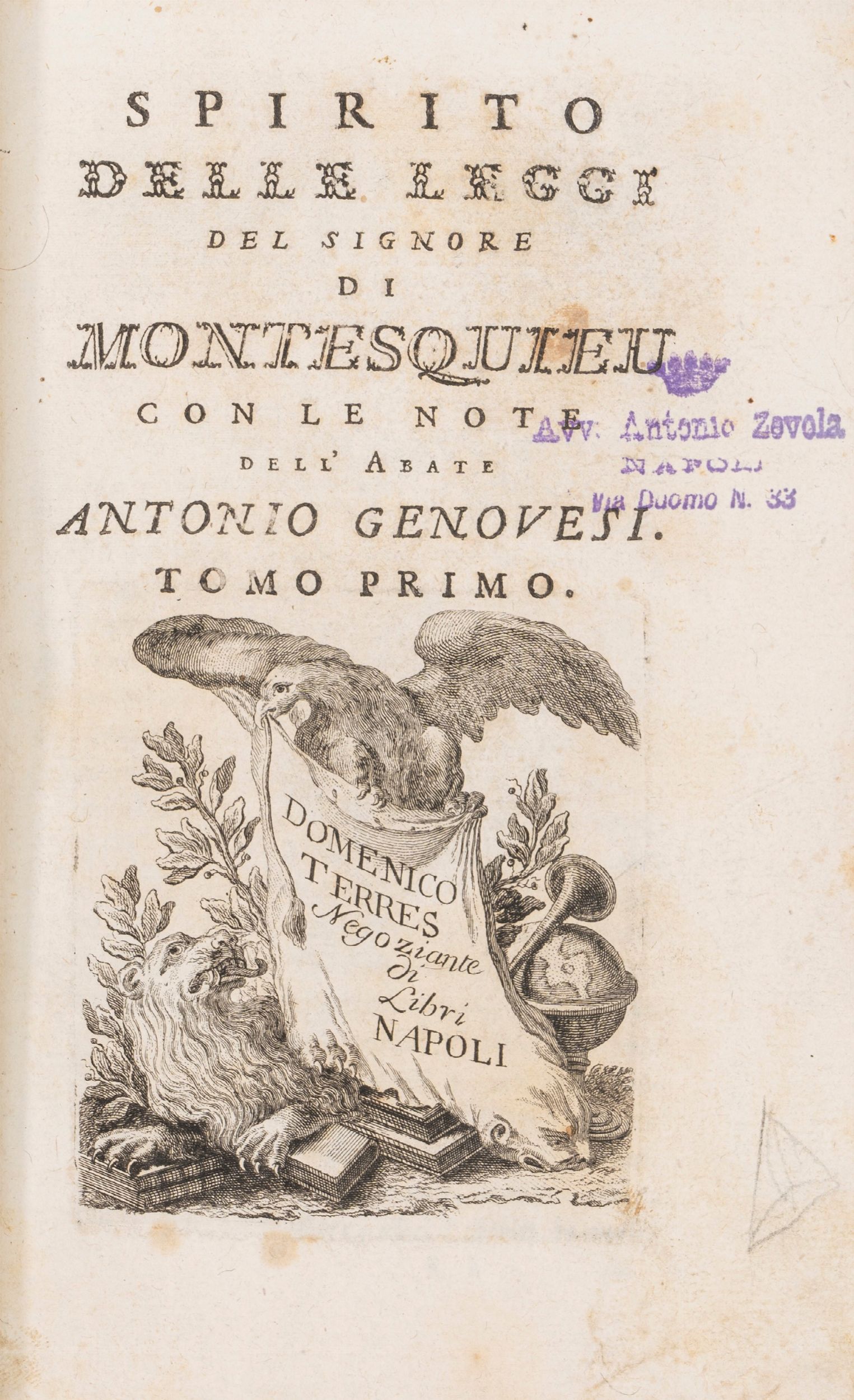 1777 Napoli, Domenico Terres, 1777. In 8°, voll. 4 legati in due, ritratto del Genovesi inciso su rame da S. Giampiccoli, antiporta calcografica raffigurante l'allegoria della Giustizia firmata 'MS Giampiccoli inc.', marca tipografica al frontespizio, pp. XVI-364 (omesse le pagine 161-164, errori di paginazione dalla p. 289 in poi); XV (ma XVI)-319; XIV (ma XVI)-310; 366. Legatura in piena pergamena. Brunitura, fioriture. Rara edizione originale.