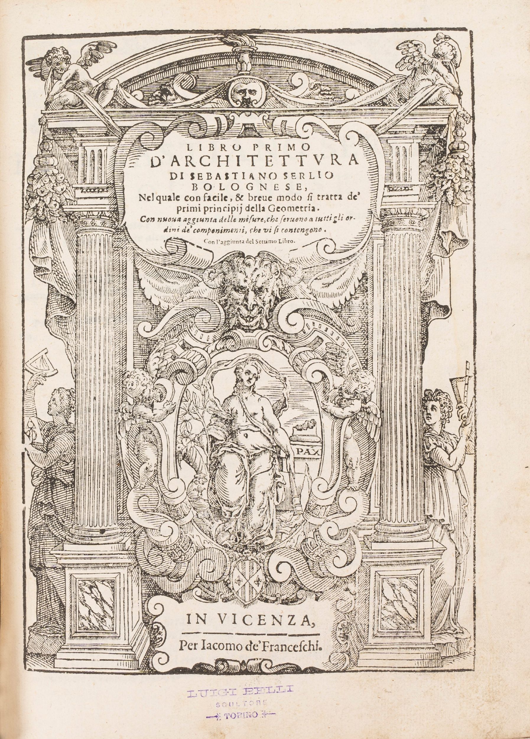 1619 Venezia, Giacomo de Franceschi, 1619. In 2°. Frontespizio generale, frontespizi architettonici in ciascuno dei 7 libri di cui si compone l'opera, moltissime illustrazioni in xilografia nel testo raffiguranti monumenti antichi e moderni, palazzi, basiliche, anfiteatri, archi, porte, sezioni, capilettera xilografici, al margine inferiore della prima carta restauro, arrossature, bruniture, aloni di umidità , margini alle volte consunti, legatura in cartone marmorizzato del sec.XVIII. Timbro di possesso di Luigi Belli, scultore, Torino.