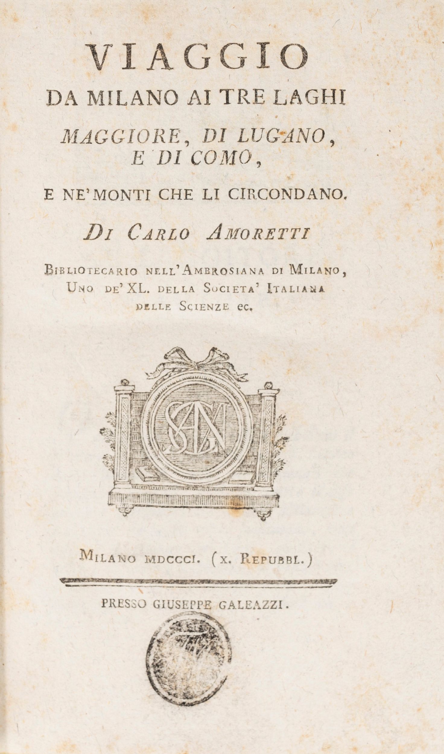 1801 Milano, presso Giuseppe Galeazzi, 1801. In 8°, 198 x 125 mm. Fregio calcografico al frontespizio, vignetta con panorama a c.V,, tre carte geografiche fuori testo ripiegate con i laghi acquarellati a mano dell'Alto Novarese, della Val Tellina e del viaggio ai laghi Maggiore, di Lugano e di Como, arrossature marginali, legatura coeva in mezza pelle marrone e cartone spugnato, difetti. Timbro nobiliare al frontespizio.