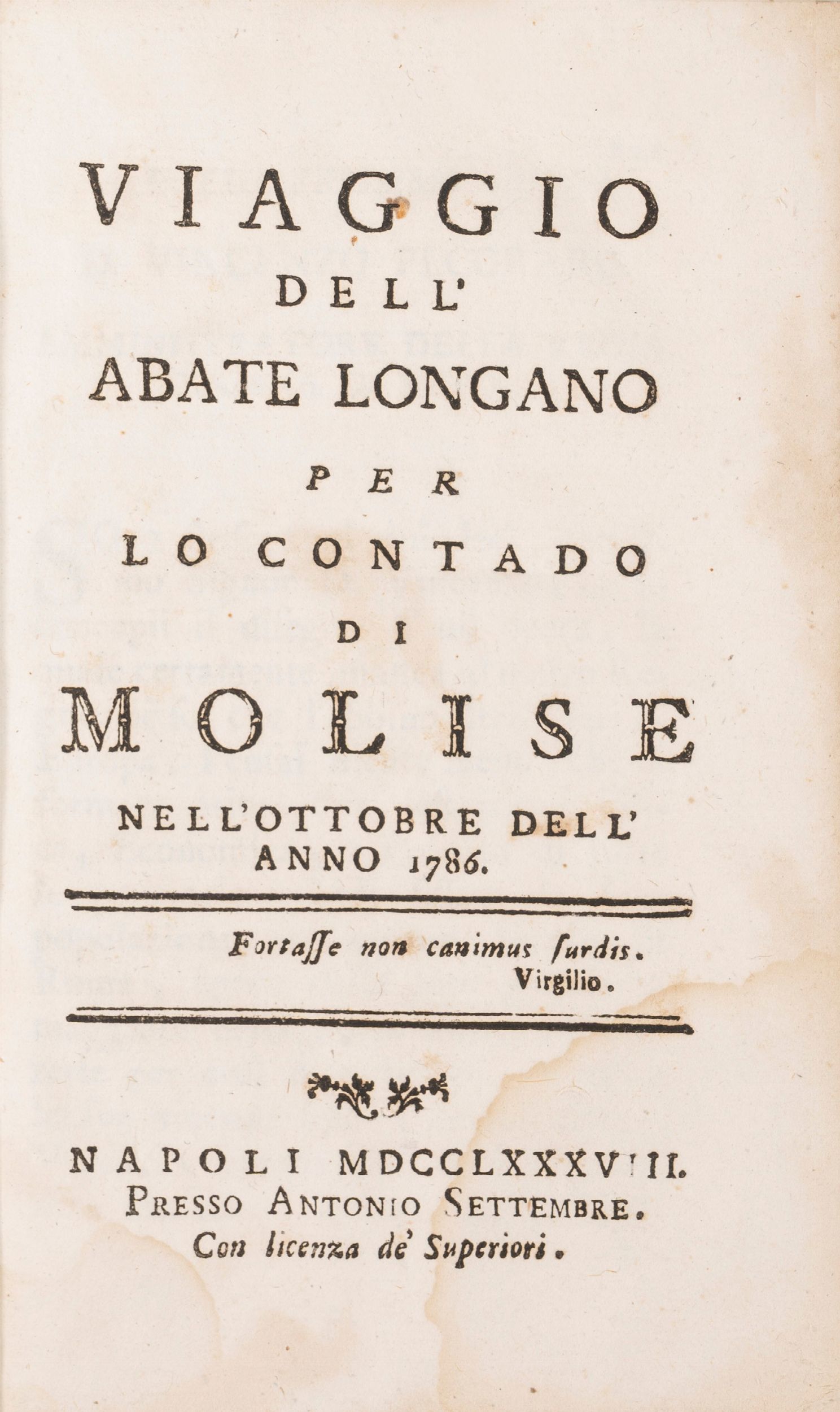1788 Napoli, Presso Antonio Settembre, 1788. In 8°, con una carta geografica del Molise e una tabella statistica ripiegata fuori testo. Legatura coeva in piena pergamena, cordoni, tassello, titolo e fregi in oro al dorso, cornice e grande 'Fleuron' incisi a secco ai piatti, tagli colorati, qualche macchia e piccole mancanze. Edizione originale estremamente rara. Alone d'umidità al margine inferiore delle prime carte, lievi fioriture.