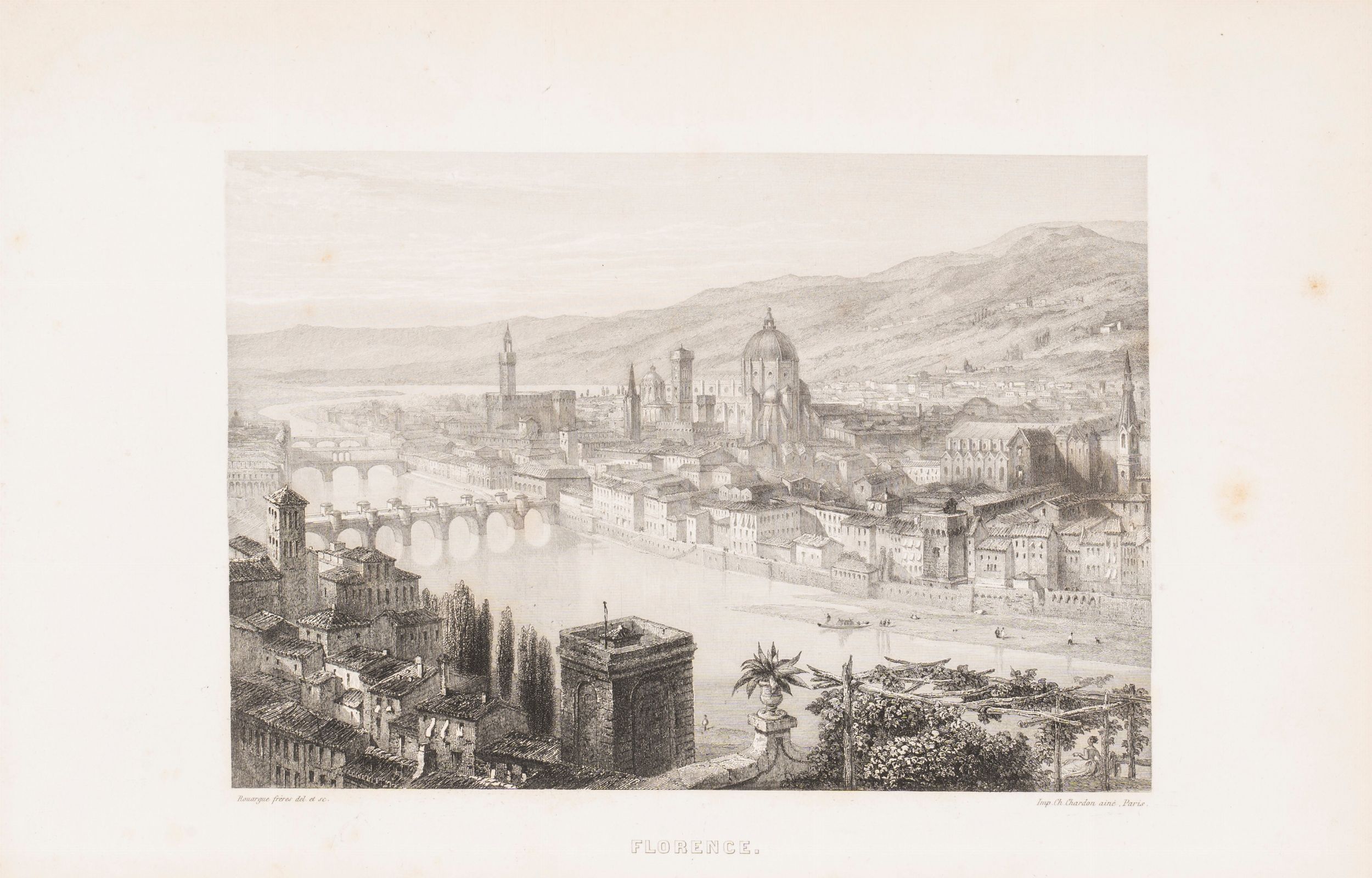 1865 Paris, Morizot, 1865. In 8°, 265 x 180 mm. 2 voll.: 'Partie Meridionale et en Sicile - Partie Septentrionale'. 46 incisioni in acciaio fuori testo, alcune a colori, tutte protette da veline, lievi arrossature, brossura editoriale conservata entro piatti in mezza tela bordeaux. Insieme nel lotto: Jules Janin . Voyage en Italie . Paris, E. Bourdin, 1839. In 8°, 260 x 165 mm. Una vignetta al frontespizio, ritratto in antiporta e 14 vedute incise in rame su tavole fuori testo raffiguranti le vedute delle città incontrate durante il viaggio, ciascuna protetta da velina, SPLENDIDA LEGATURA in piena pelle rossa con decorazioni in oro ai piatti e al dorso. Prima edizione con tavole di J.D. Harding, Bartlett, Raphaël e S. Prout, incise su acciaio da Smith, Challis, Higam e Topham. Prout.
