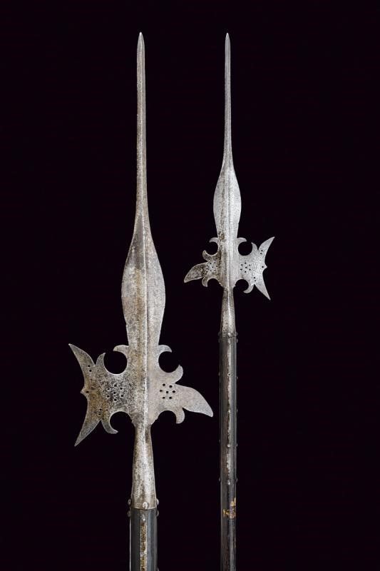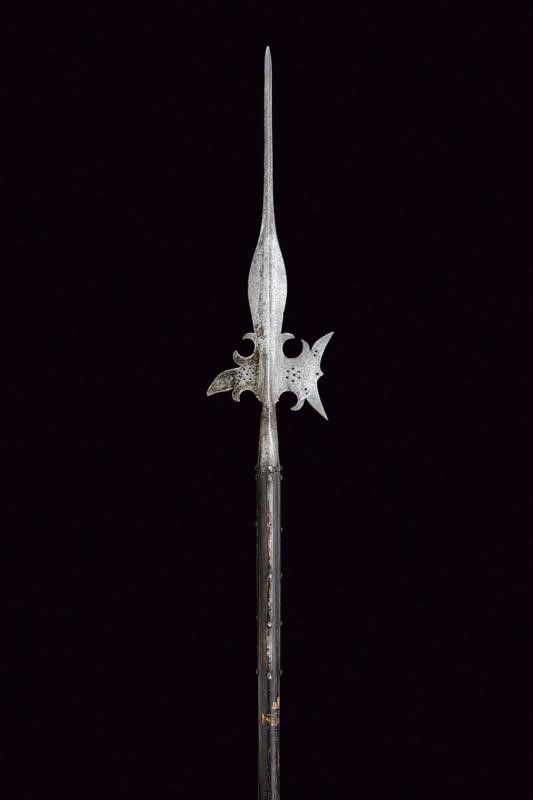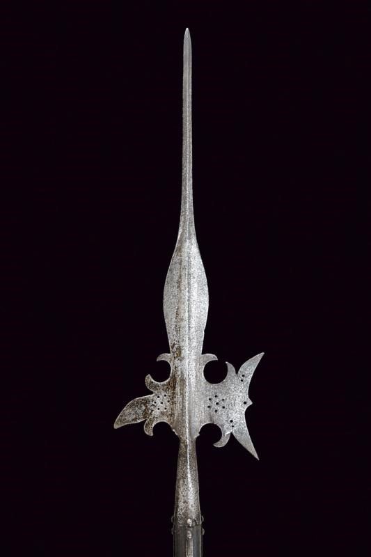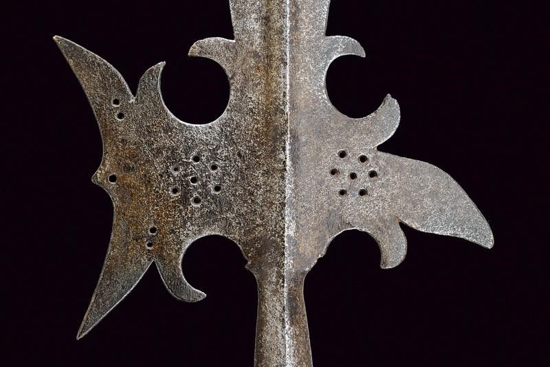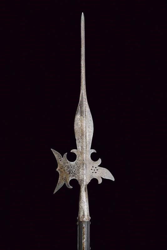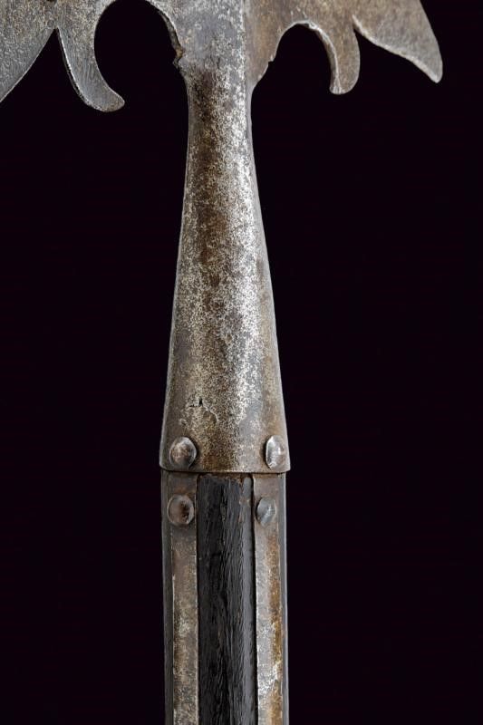 Italia, lunghezza 236.5 cm. 1600 circa Cuspide di sezione a losanga su segmento a foglia costolato. Scure a doppia incavatura traforata e dotata di ali, becco lavorato en suite. Gorbia troncoconica in ferro. Fusto ligneo cilindrico con quattro bandelle. Di rara tipologia.