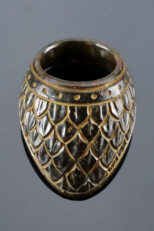 XIX Secolo In corno, di forma ovale e appuntita, la superficie esterna completamente scolpita a squame con bordi dorati, un bordo decorato con bande circolari e puntini. Piccolissime mancanze.