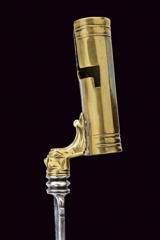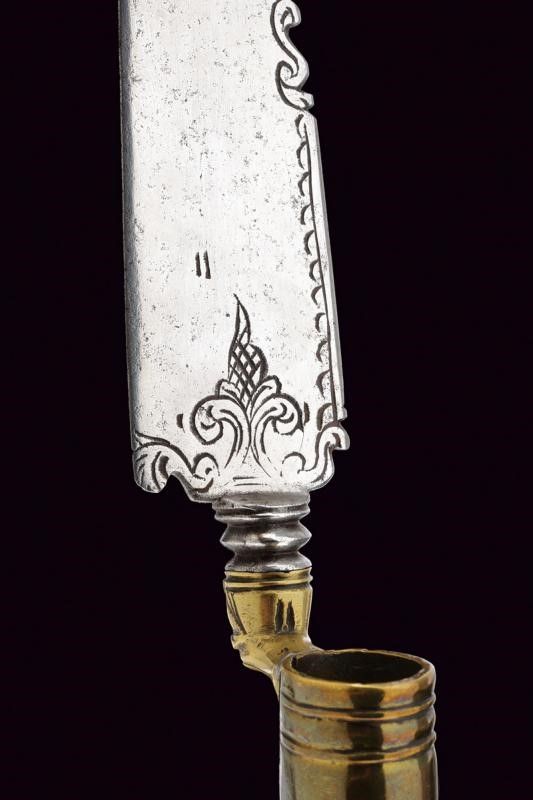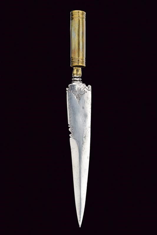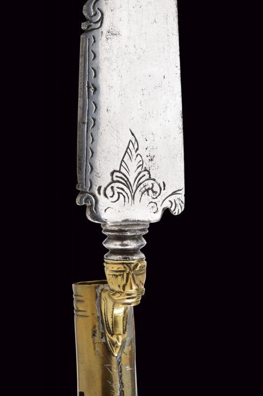 Lama di forma triangolare a un filo e controfilo; il dorso e la base leggermente intagliati e incisi a motivi floreali. Collo in ottone lavorato a volto barbuto. Manicotto faccettato e decorato ad anellature.