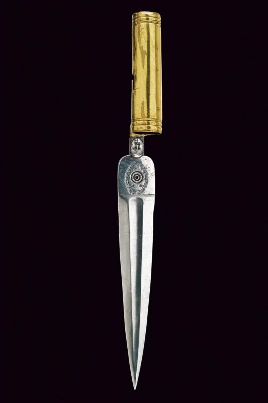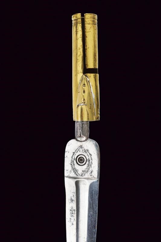Lama dritta a due fili con sguscio centrale; il tallone intagliato ed inciso a motivi floreali e geometrici. Il nodo intagliato con un volto barbuto. Manicotto liscio in ottone con anellature alle estremità .