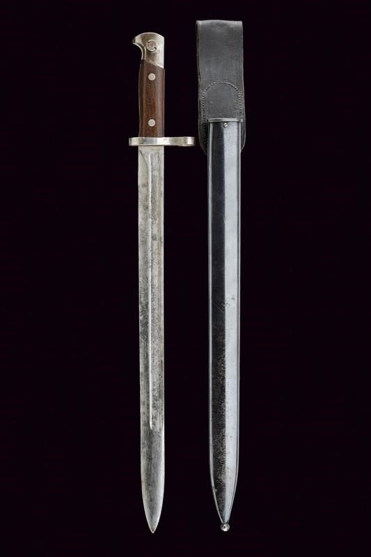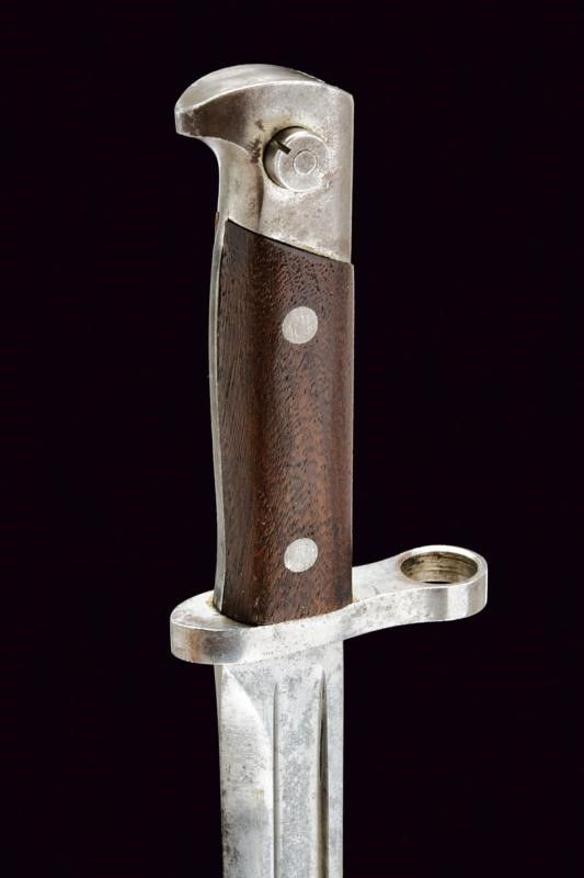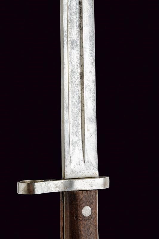 USA, lunghezza 52 cm. Prima metà del XX Secolo Lunga lama dritta a un filo e breve controfilo, profonda scanalatura dorsale, tallone. Crociera ad anello marcata 'WINCHESTER REPEATING ARMS CO.' Impugnatura con guancette in legno, molla funzionante. Fodero in ferro brunito con taschetta in cuoio.