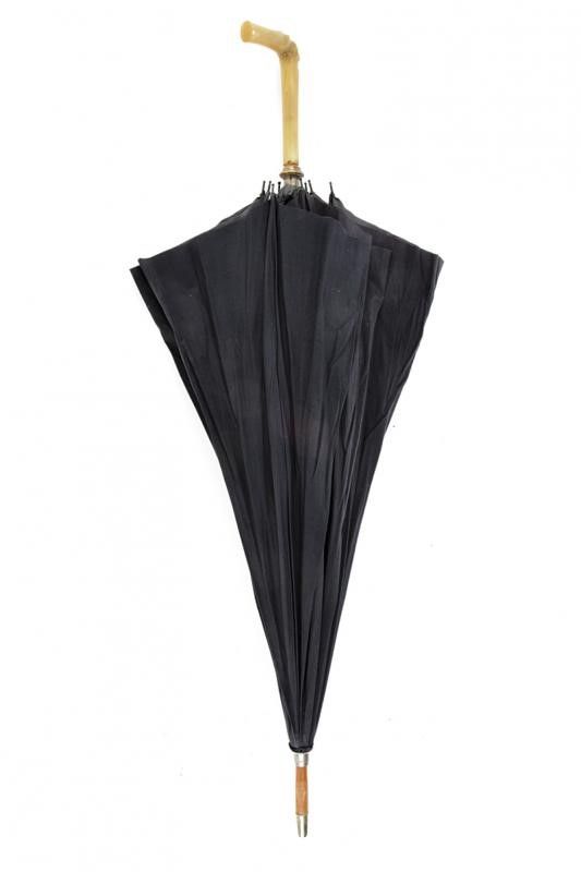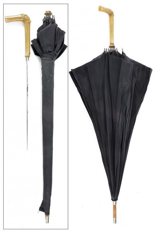 Europa, lunghezza 48,3 cm. inizio del XX Sec. Corta lama dritta a un filo (lievi intaccature). Impugnatura in corno chiaro di mucca, dotata di pulsante di rilascio. Fodero a bastone con ombrello in tela nera (ben conservata, con minimi difetti). Piede metallico. Lunghezza totale da chiuso: 90,5 cm. Raro.