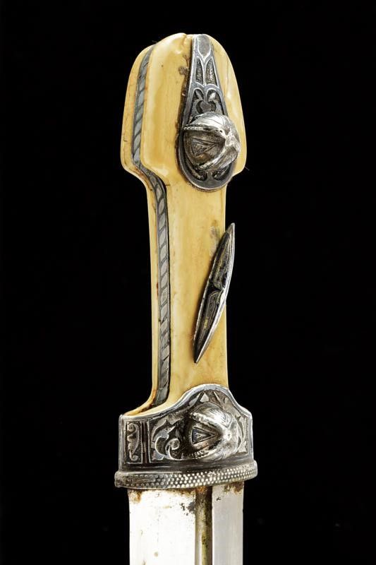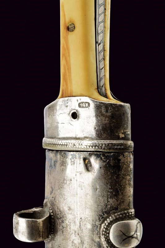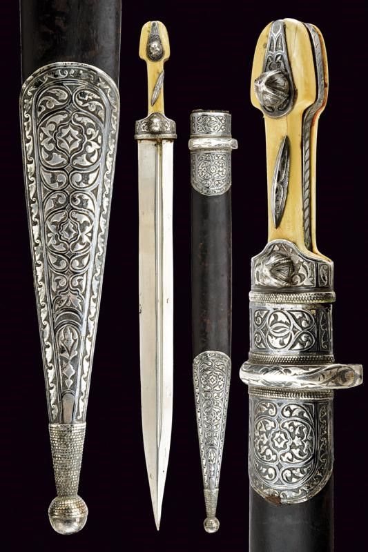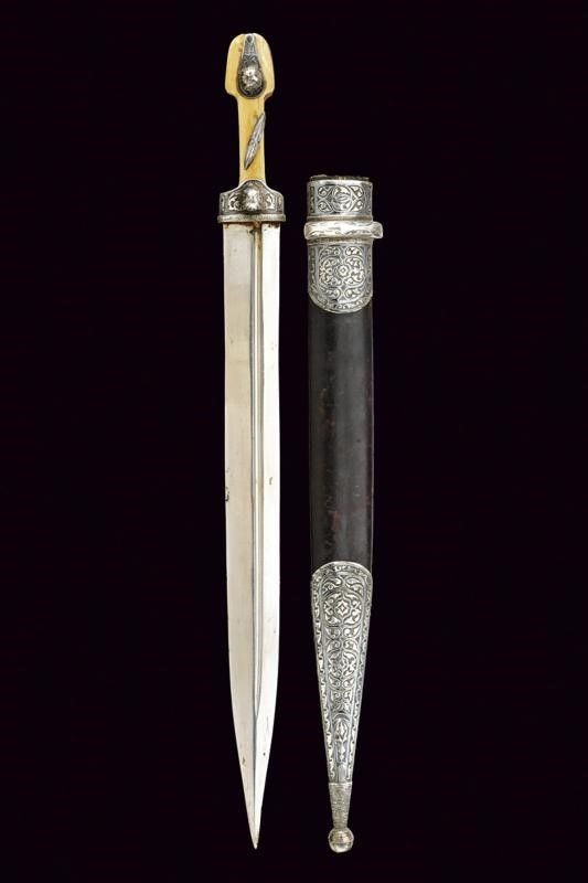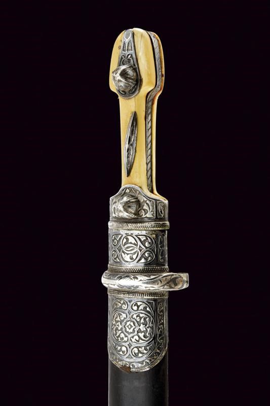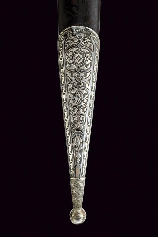 Caucaso, lunghezza 55.5 cm. 1900 circa Lunga lama dritta a due fili con profonde scanalature asimmetriche e resti di un'inscrizione. Impugnatura con guance in zanna di tricheco e fornimenti in argento incisi e niellati a motivi floreali e geometrici. Punzone '84' e un altro marchio poco leggibile. Fodero in legno rivestito di cuoio con fornimenti in argento recanti punzoni russi.