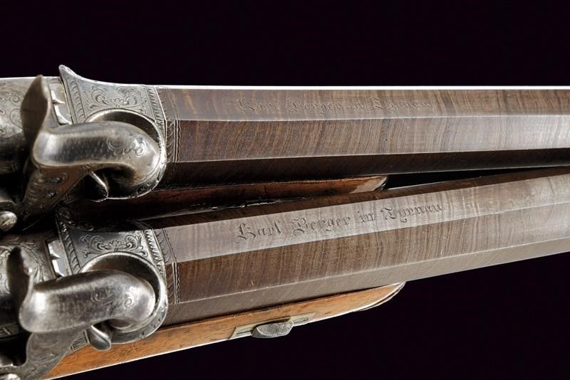 Canne ottagonali rigate (anime pulite, rigatura ancora visibile), damascate e brunite, con firma 'Karl Berger in Tyrnau', le basi incise e con duplice cornice; sotto alle canne numeri '1' e '2'. In volata mirino di precisone, cal. 12 mm. Lunghe codette incise a motivi floreali, munite di alzo. Belle batterie a luminello a molla indietro con cartella piatta firmata 'Berger' e finemente incisa a motivi floreali; interessanti anche le contropiastre, simmetriche non solo per posizione ma anche per struttura e decori, queste però marcate 'in Tyrnau'. Mezze casse in legno (piccoli difetti) con muso scolpito a conchiglia e con calci micro-zigrinati. Fornimenti in ferro incisi en suite con le batterie, ponticelli con poggiadito. Meccanica funzionate. Da cassetta quindi prive di alloggiamento per la bacchetta. Interessante paio di pistole di buona qualità .