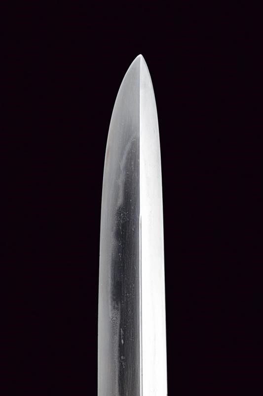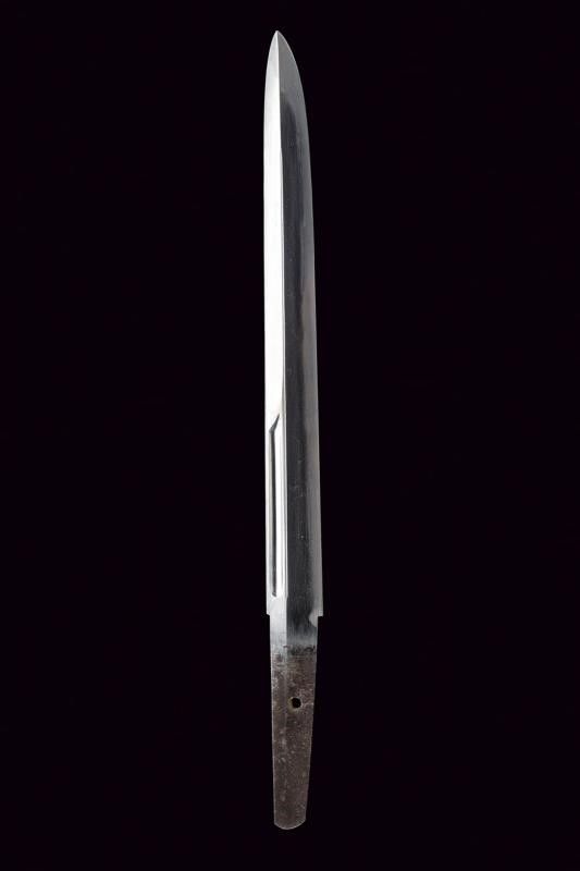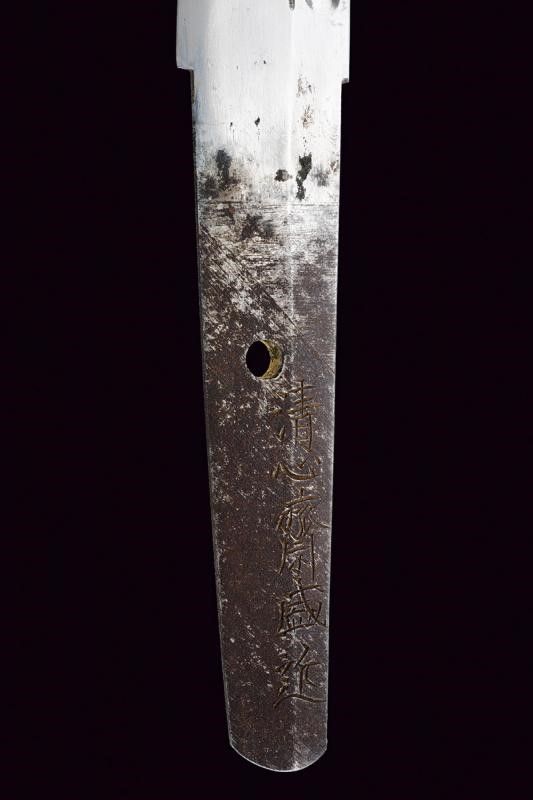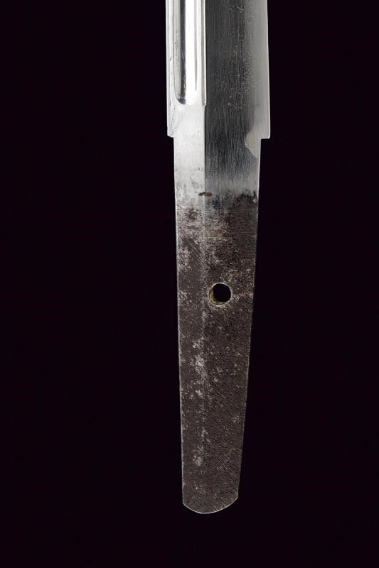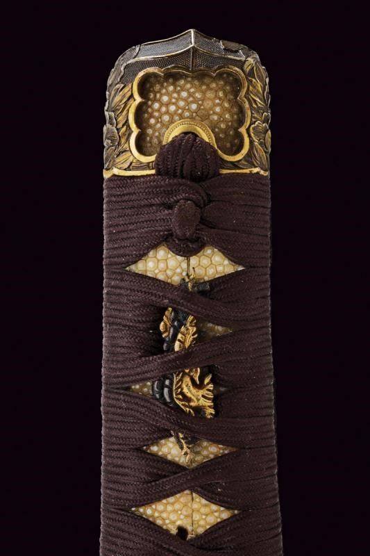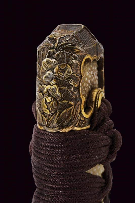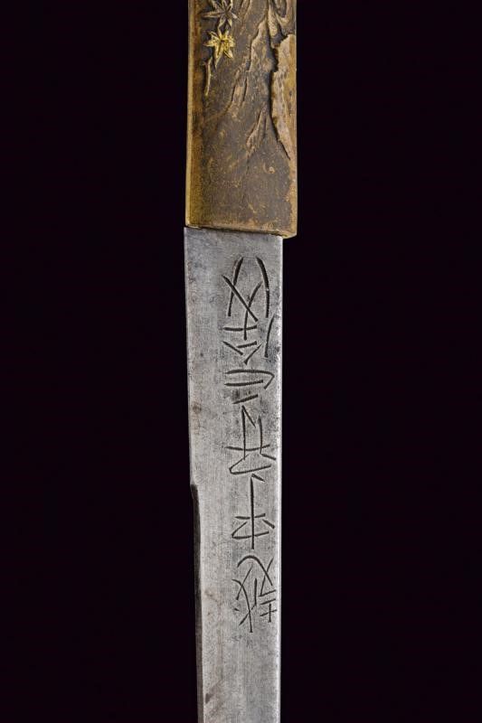 Giappone, lunghezza 39.8 cm. Periodo Edo (1603-1867) Lama Kogarasumaru Zukuri, con Nagasa di 25.4 cm. Hada: itame con nie-deki, Hamon: suguha; Habaki in rame. Nakago mei: 'Seishinsai Morichika'. Koshirae contemporaneo con fornimenti in shakudo decorati con peonie su fondo nanako. Tsuba in shakudo decorata a fogliame. Menuki parzialmente dorati. Tsuka-ito in seta marrone scuro. Bella saya in lacca rossonera. Kozuka con cervi in campagna, Kogatana firmata 'Etchu (no) kami Masatoshi'. Periodo Edo, epoca Bunkyu / Genji (1861-1864).