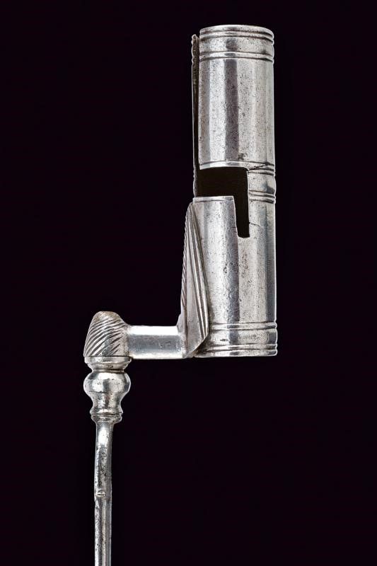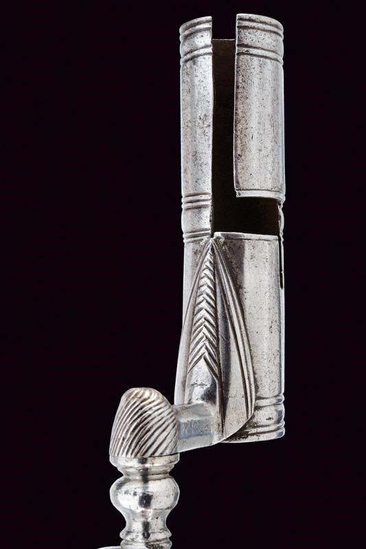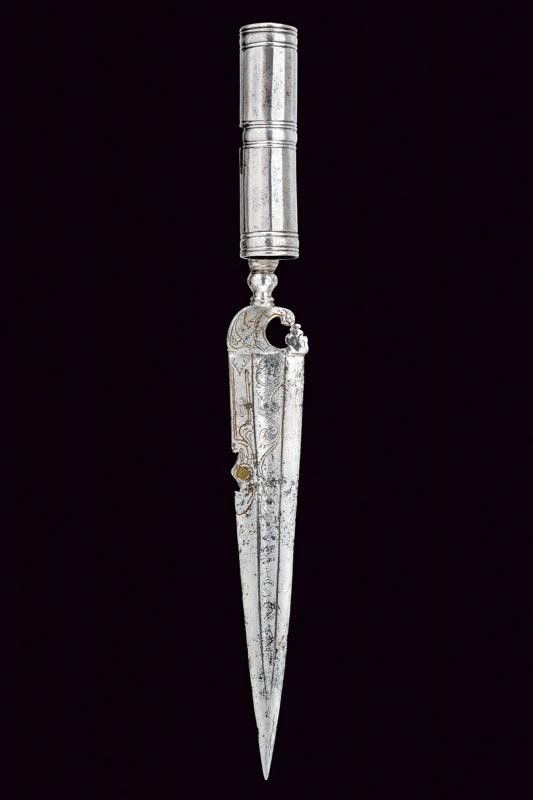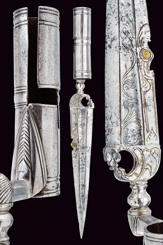 Italia meridionale, lunghezza 35.1 cm. Lama dritta a un filo e controfilo con scanalatura centrale incisa. Il dorso, sotto al controfilo, intagliato ed inciso, munito di occhio in ottone inciso con una mezzaluna. Il tallone intagliato ed inciso con un drago. Collo e manicotto in ferro lavorato, il secondo faccettato e ornato ad anellature.
