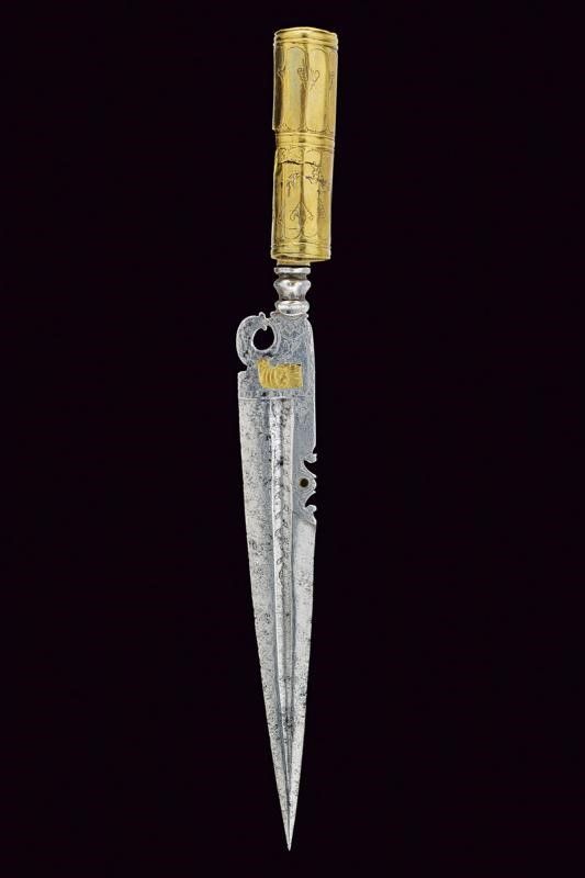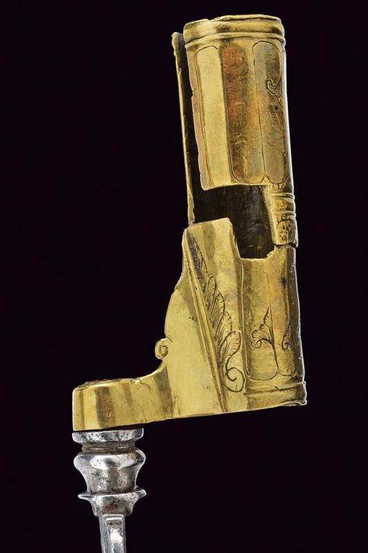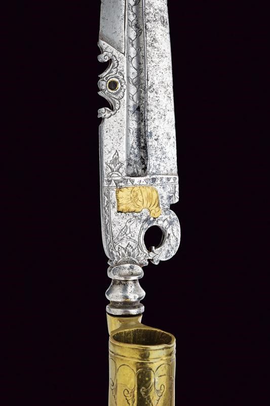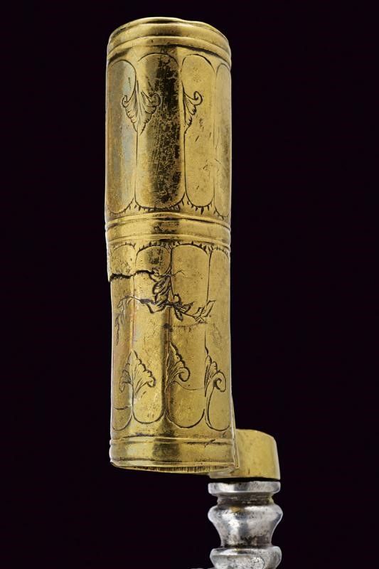 Italia meridionale, lunghezza 35.8 cm. Lama dritta a un filo e controfilo con profonda scanalatura centrale incisa. Il dorso intagliato sotto al controfilo ed inciso, recante un occhio circolare nero foderato in ottone. Il tallone intagliato ed inciso con effige di un pesce e ornato con una placca in ottone dorato, raffigurante una cornucopia. Collo e manicotto in ottone lavorati in un unico pezzo, il secondo faccettato ed inciso a motivi floreali (crepa vicino all'apertura).