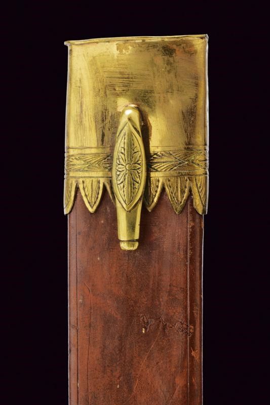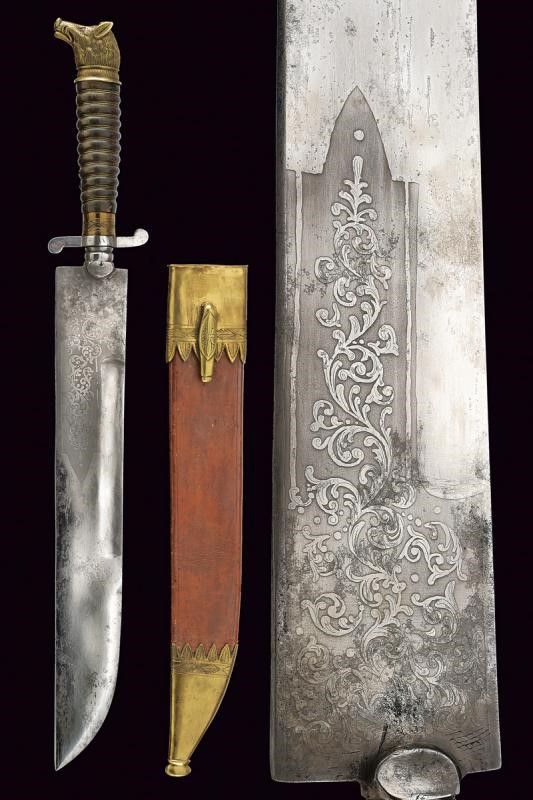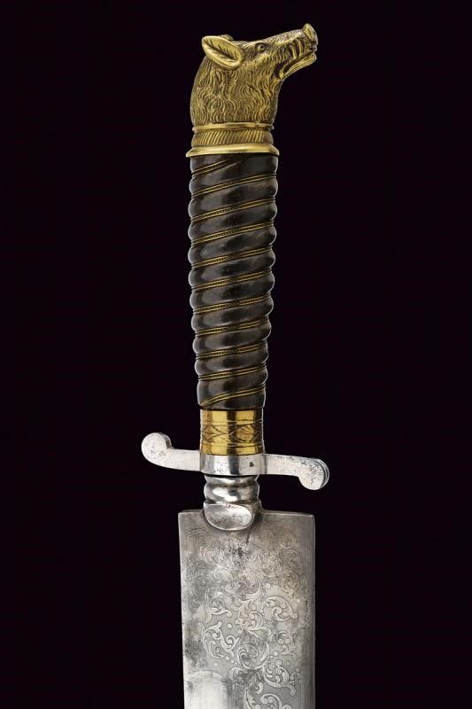 Italia meridionale, lunghezza 51.2 cm. Larga lama a un filo e controfilo leggermente sgusciata sotto al dorso, finemente incisa all'acquaforte a motivi floreali su fondo opaco al forte. Piccolo elso a 'S' in ferro. Impugnatura in corno a spire (piccole mancanze) con trecciola in filo di ottone, ghiera incisa a fogliame, il pomo in ottone a testa di cinghiale. Fodero in cuoio con fornimenti in ottone decorati a motivi floreali.