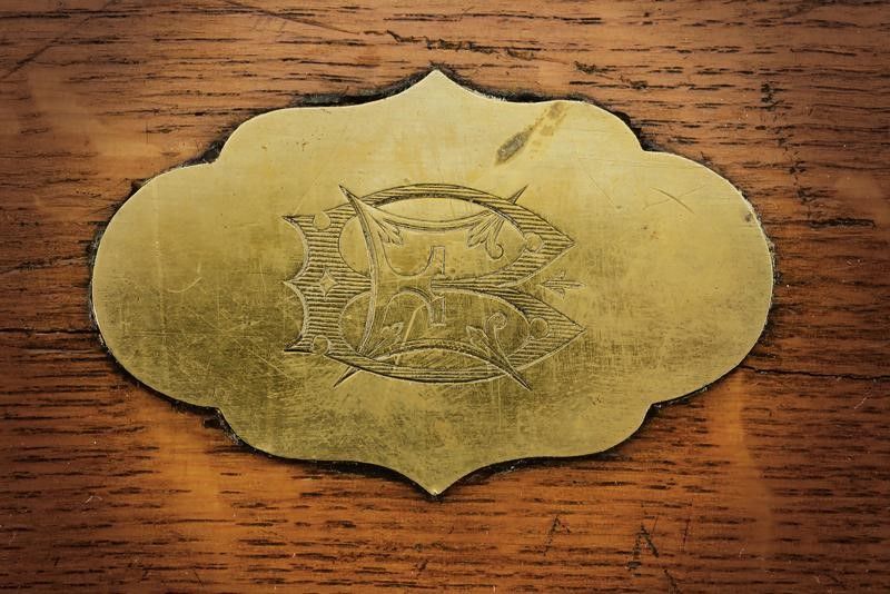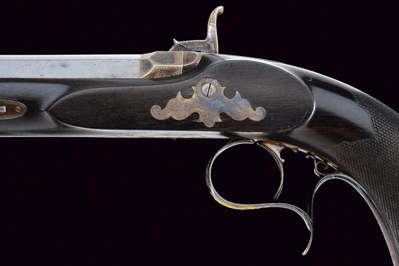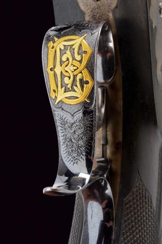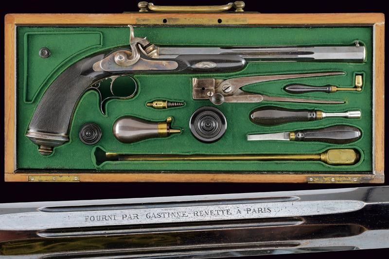 Canna rigata, a tre ordini, lavorata nel segmento centrale a sedici facce con sottili scanalature e marcatura 'FOURNI PAR GASTINNE-RENETTE A PARIS'; le estremità a ettagoni, la base finemente incisa a motivi floreali e geometrici, la volata con mirino di precisione, cal. 11.3 mm; codolo inciso en suite con la base, dotato di traguardo regolabile brunito color blu. Batteria a luminello a molla in avanti, cartella piatta con codetta ribassata, finemente incisa a motivi floreali e geometrici. Cassa a tre quarti in ebano con calcio micro-zigrinato e fornimenti parzialmente bruniti con finissime incisioni floreali, il ponticello con monogramma 'EB' in oro ed argento. Nella sua cassetta in legno rivestita internametne con panno verde, completa di tutti gli attrezzi e della chiave. Il coperchio con lo stesso monogramma della pistola.