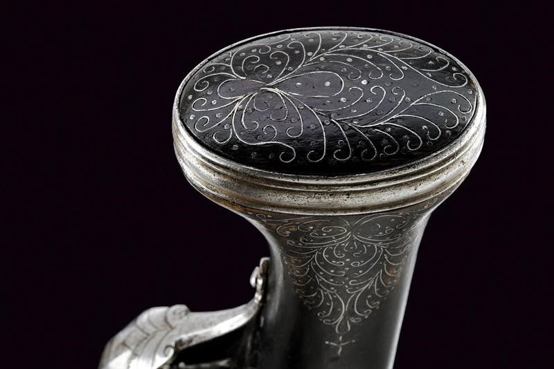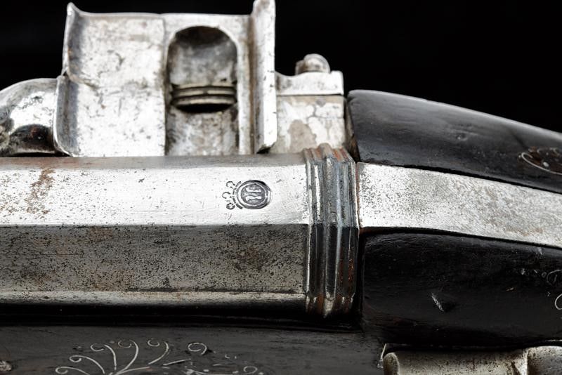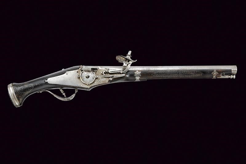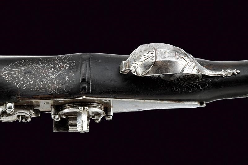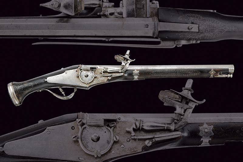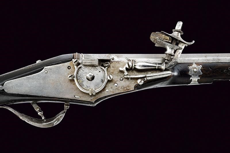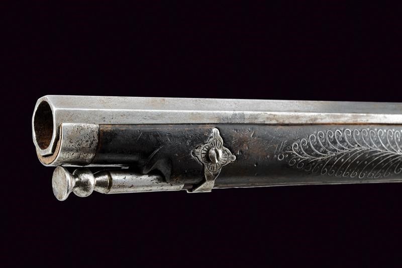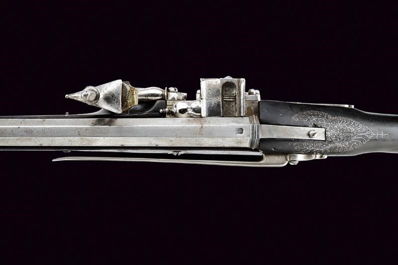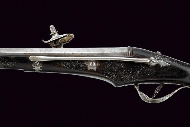 Lunga canna liscia ottagonale leggermente rastremata verso la volata, culatta impressa con il marchio di controllo di Ferlach e decorata con una cornicetta, cal. 14 mm. Batteria a ruota esterna leggermente incisa a motivi floreali, cartella di forma romboidale piatta, cane con corpo affusolato, angolo di raccordo intagliato a motivi floreali e collo di sezione rettangolare, copriscodellino scorrevole, all'interno punzone a doppia freccia. Cassa intera in legno di noce dipinto di nero. Bellissimi intarsi in filigrana a racemi e motivi geometrici su quasi tutta la superficie lignea. Fornimenti in ferro, ponticello strutturato a tre facce leggermente intagliate ed incise. Bacchetta in legno con battipalla in ferro. Gancio da cintura.