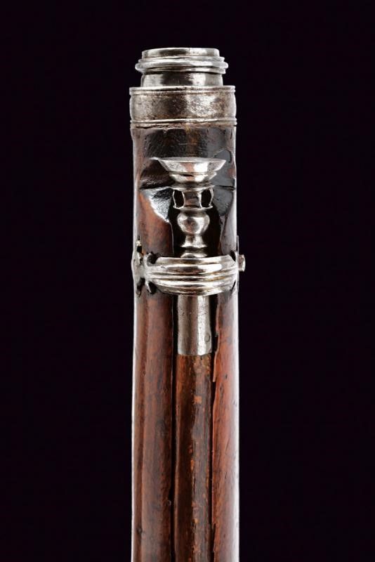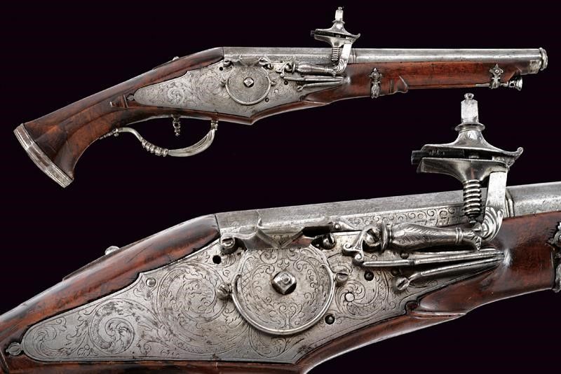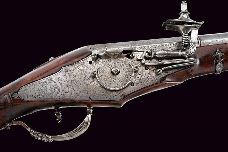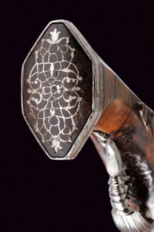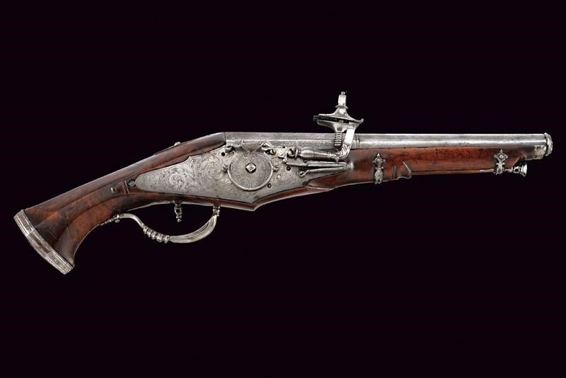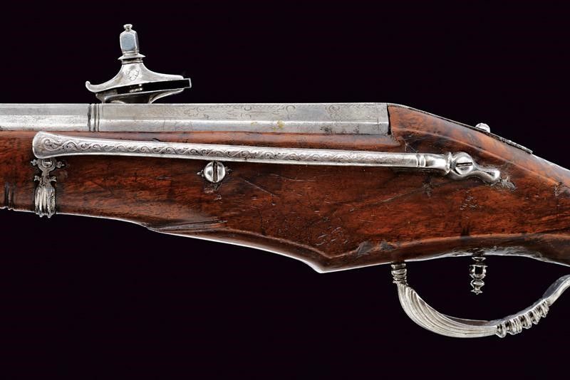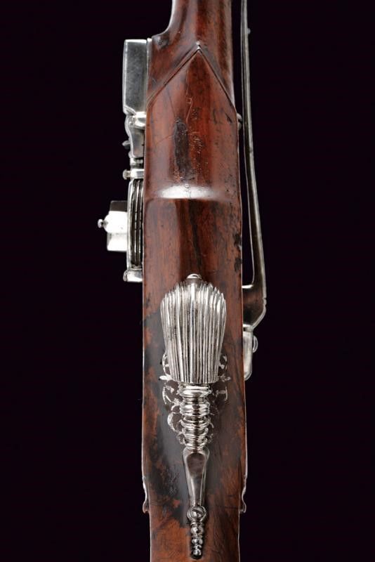 Canna liscia a due ordini con anellature al cambio, prima ottagonale ed incisa a motivi geometrici, poi a sedici facce e con gioia di bocca, cal. 14 mm; codetta incisa. Batteria incisa a motivi floreali, con ruota esterna e copriscodellino mobile; all'interno della piastra il punzone 'GB' con croce. Cassa intera in legno con fornimenti in ferro, ponticello finemente scanalato, coccia dotata di un elemento traforato, gancio da cintura inciso, bacchetta in legno con battipalla in ferro.