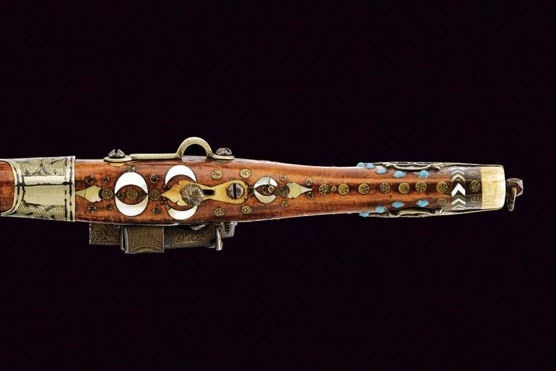 Metà del XIX Secolo Canna liscia in ferro a due ordini, la prima parte con profonde scanalature longitudinali, dopo tonda, incisa a motivi floreali e con volata fortemente strombata a modo circolare. Codetta decorata con intarsi in ottone. Batteria alla micheletta decorata en suite e munita di punzone. Cassa intera in legno (vecchi restauri) decorata con fornimenti traforati in metallo bianco sul calcio, con intarsi e coccia in zanna di tricheco e con piccole rosette in ottone, il calcio ornato di turchesi e placche in madreperla e corno. La contropiastra con gancio per un anello da sella. Anello reggicanna in argento traforato, inciso e niellato. Rara.