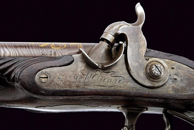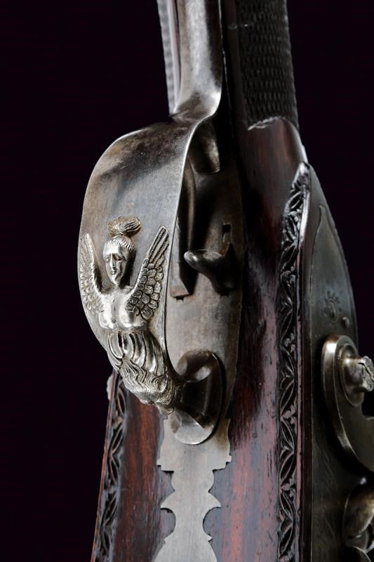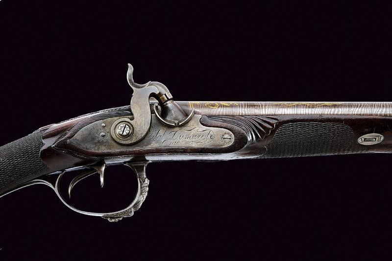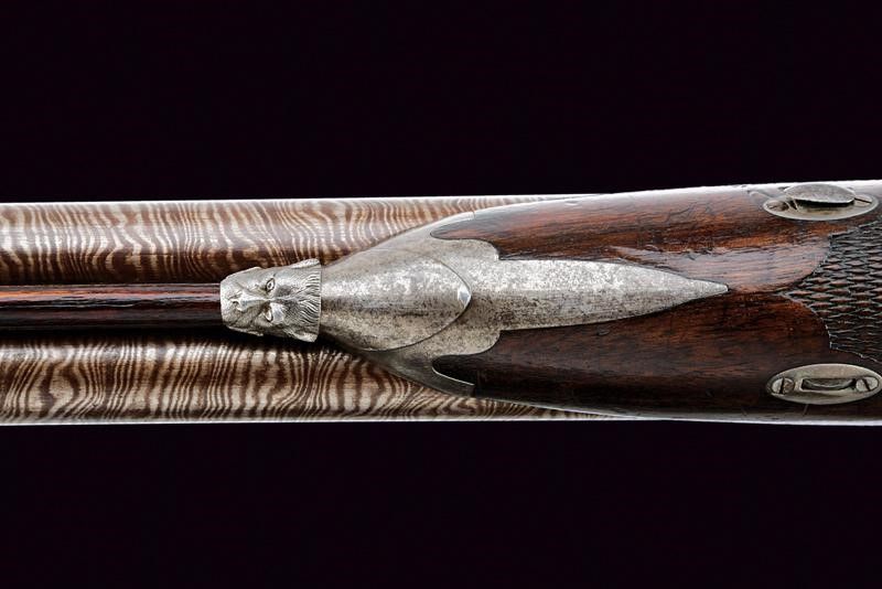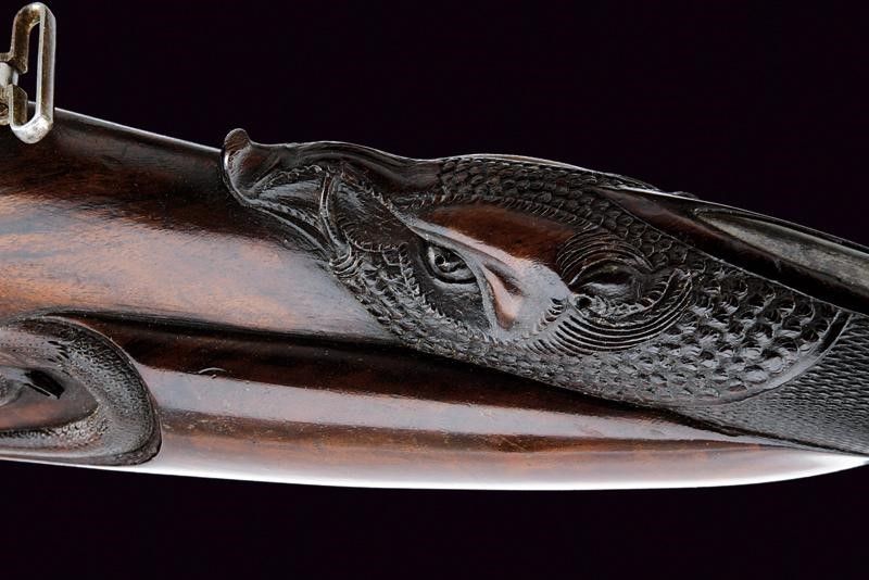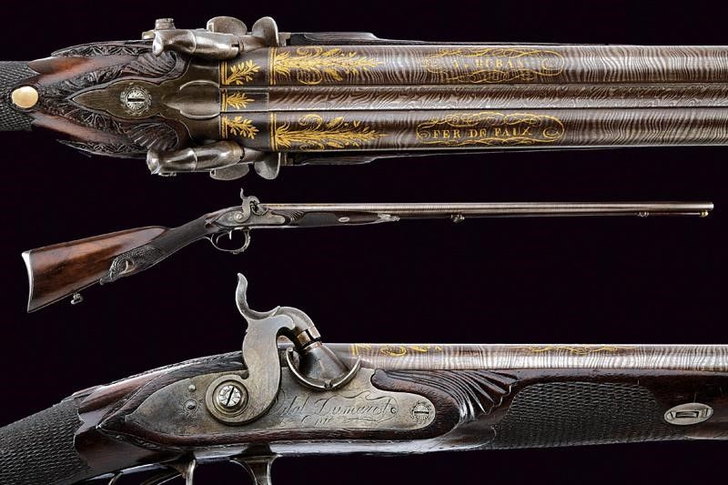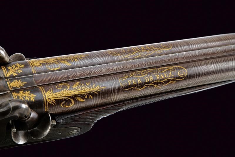 Canne lisce tonde, giustapposte, in damasco con bella brunitura, marcate nella prima parte 'A. RUBAN FER DE FAUX' e decorate a motivi floreali, tutto in oro. La bindella con mirino, cal. 17 mm. Codetta con traguardo a sella. Batterie a cartella piatta firmate 'Vital Dumarest & C.nie', le viti finemente intagliate. Mezza cassa in radica, astina e collo zigrinati. L'area attorno alle batterie e alla codetta finemente scolpita a palmetta e a motivi floreali. La parte inferiore della pala intagliata a testa di cinghiale (piccolissima mancanza). Fornimenti in ferro, il muso con piccola testa di mostro che ospita la bacchetta. Il ponticello con figura alata in rilievo.