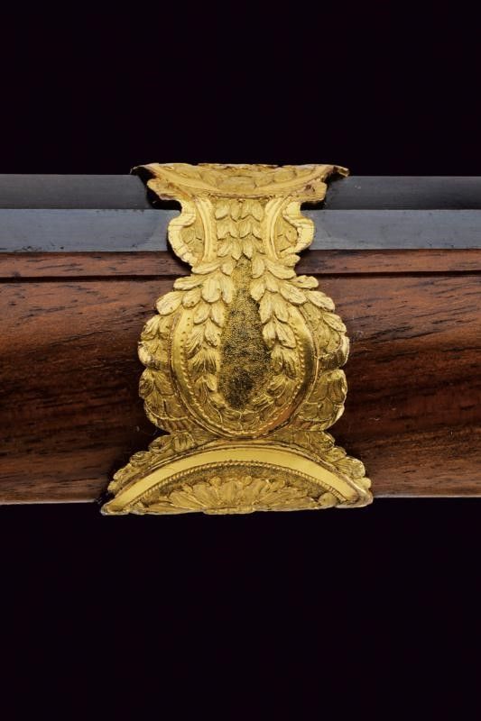 Canna tonda liscia, a due ordini, con anellature al cambio, brunita (finitura rinfrescata), con punzoni dorati della Real Fabbrica di Napoli tra gigli alla culatta, dotata di mirino in argento a coda di rondine, cal. 16 mm; codetta incisa, dorata e marcata '44'. Batteria a cartella leggermente tondeggiante, decorata a motivi floreali con faretra e frecce in oro ed argento nello stile di Tula. Mezza cassa in legno, magistralmente scolpita, recante finissimi intagli floreali, sul lato esterno del calcio tralci di vite. Straordinari fornimenti in bronzo dorato al mercurio, in parte traforati e foderati da placche in ferro azzurrate a specchio, lungo ponticello con uccelli in bassorilievo su fondo granulato, contropiastra formata da bande di foglie e ghirlande, coccia con trofeo, scudetto con monogramma 'FW' sotto ad un elemento decorativo in ferro fra trofei, catena e drago in bronzo dorato al mercurio. Bocca in corno scuro, fascetta reggicanna e reggibacchetta in bronzo dorato, decorate en suite. Bacchetta in legno con mancanza.