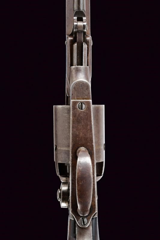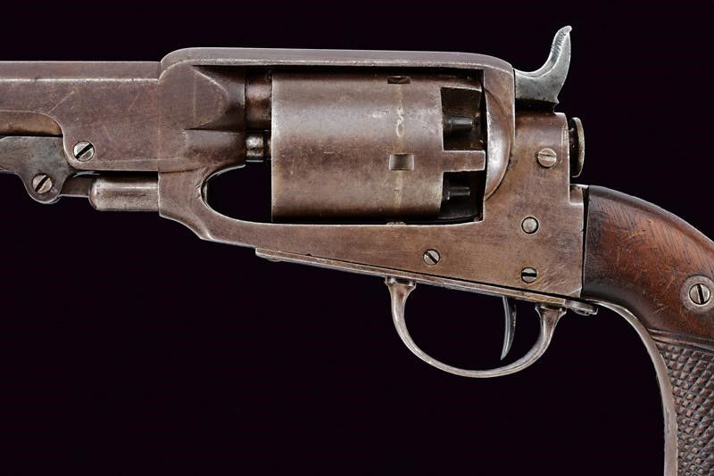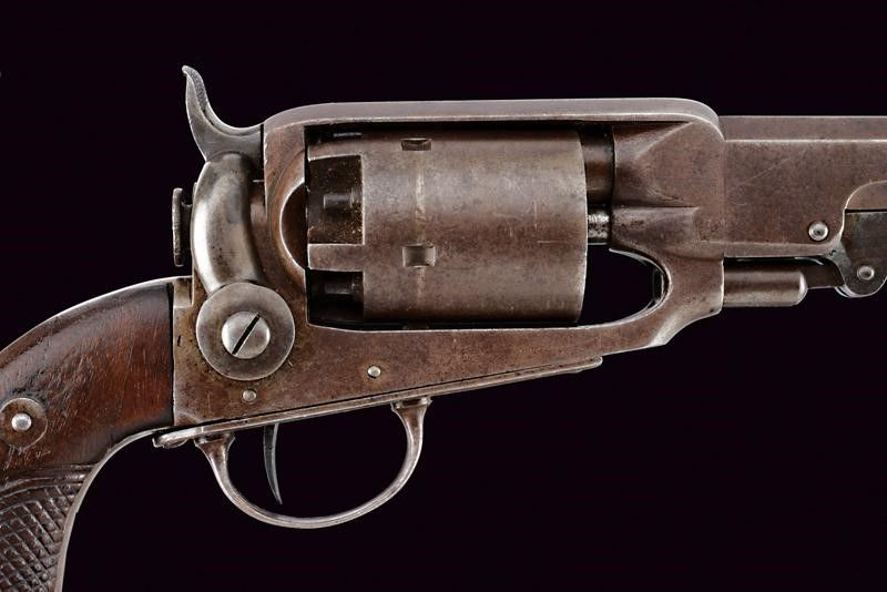 1861 - 1862 Canna ottagonale da 8', rigata (qualche segno d'uso all'interno, rigatura visibile), marcata alla base 'B. F. JOSLYN / PATD. MAY 4th, 1858', mirino, cal. 44. Tamburo liscio a cinque colpi. Meccanica funzionante. Castello liscio con punzone '2' in basso. Side hammer. Ponticello in ferro (la vite di tenuta posteriore ha ceduto leggermente). Guancette in legno con segmento zigrinato al centro, una con tacche, apparentemente non casuali, al bordo inferiore. Matr. '4xx' all'interno dell'impugnatura. Superfici sostanzialmente ben conservate con qualche lievissima intaccatura.