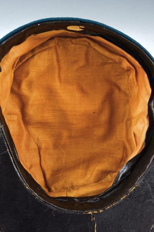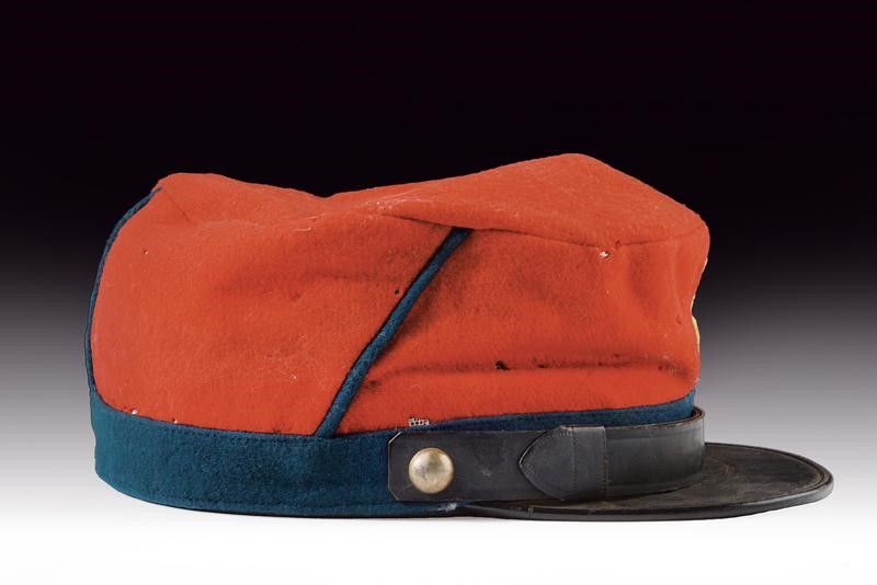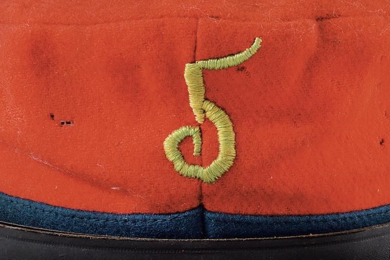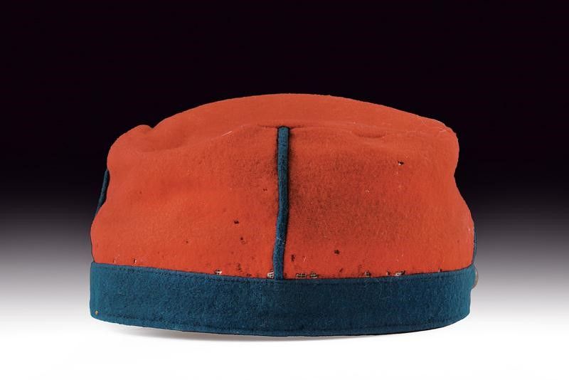 Regno d'Italia, altezza 10 cm. inizio del XX Sec. In panno rosso con montanti verde scuro, ricamato con numero 5, visiera nera con soggolo in cuoio nero, bottoni lisci, Interno con alluda in marocchino nero, cuffia in stoffa marrone. Alcuni trascurabili fori da tarme. Berretti di questo tipo erano commissionati dai reduci garibaldini per sostituire gli originali, rovinati o perduti durante le guerre d'indipendenza, per poterli indossare nelle occasioni ufficiali.