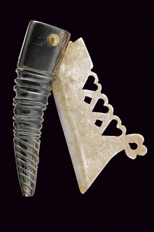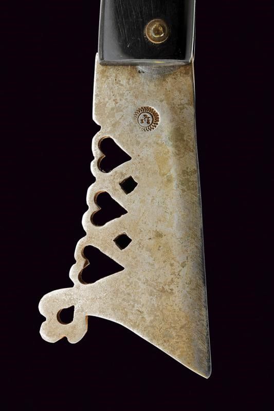 XIX Secolo Larga e corta lama a un filo di forma tipica, il dorso traforato con tre cuori, due losanghe e con una sforatura a goccia. Marca alla base. Impugnatura in corno scolpito. Raro.