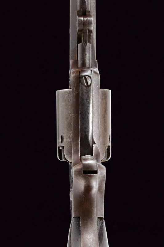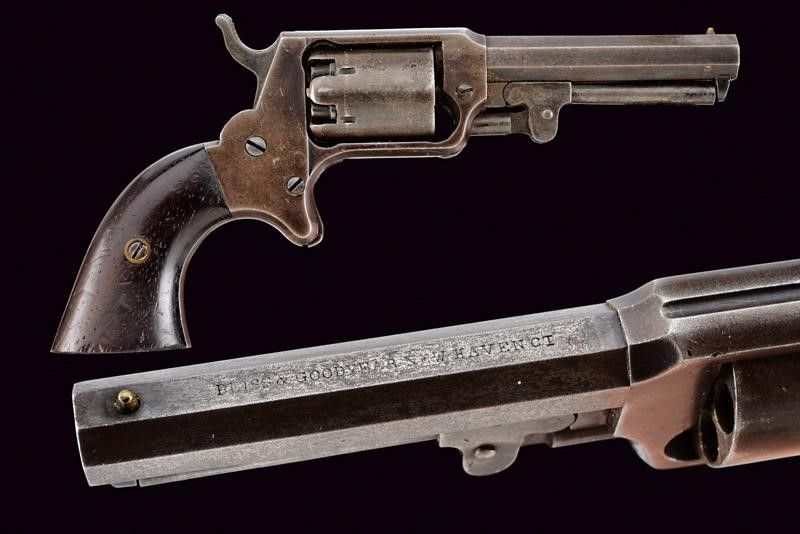 USA, lunghezza 17,8 cm. 1860 circa Canna ottagonale (segni d'uso all'interno, rigatura visibile) con mirino conico, recante resti di marcatura 'BLISS & GOODYEAR NEW HAVEN CT.' cal. 28. Tamburo a sei colpi. Meccanica funzionante. Castello con grilletto a sprone. Matr. '2xx' sul lato inferiore della canna, tracce della stessa numerazione sotto all'impugnatura. Resti di finitura color blu antica. Impugnatura con guancette in legno.