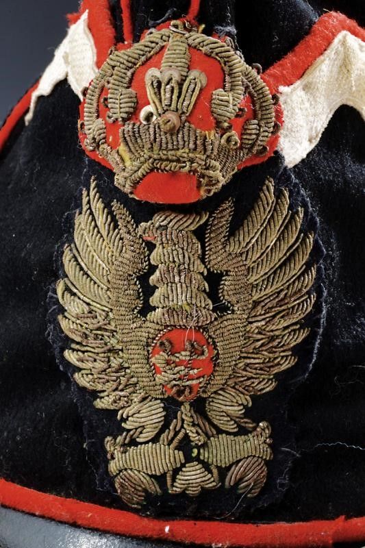 1930/40 In panno nero con visiera semi-rigida in cuoio e profilature rosse e con banda bianca, l'aquila sotto corona in canutiglia argentata. L'interno con alluda in pelle nera e cuffia in panno nero.