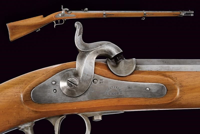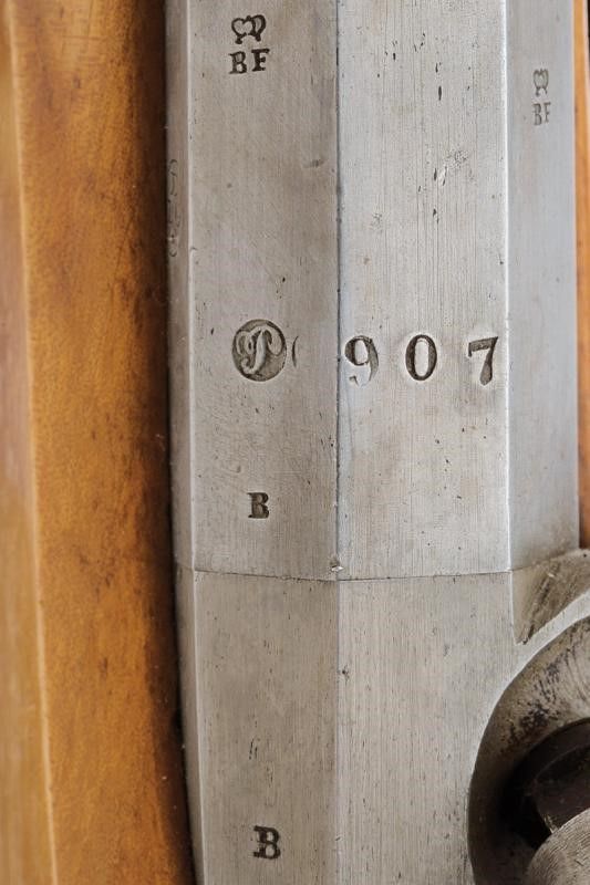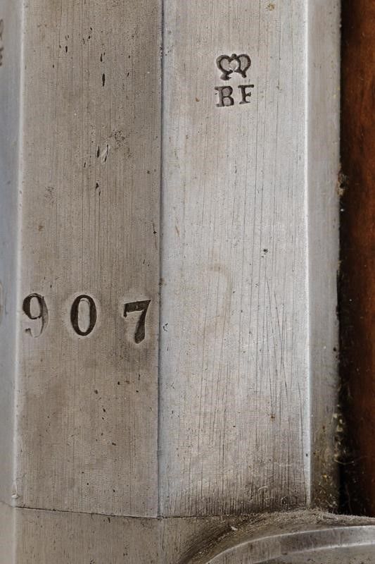 Liegi, lunghezza 132 cm. Canna rigata (anima pulita, rigatura visibile), tonda, con base ottagonale marcata 'BF' sotto corona, 'B', 'P' e con numero '907', mirino, cal. 9.5 mm; lunga codetta liscia. Batteria a molla in avanti firmata 'BEURET FRERES LIEGE' e con punzone 'BF' sotto corona; cassa intera in legno chiaro con fornimenti e bacchetta in ferro. Probabilmente mai usata.