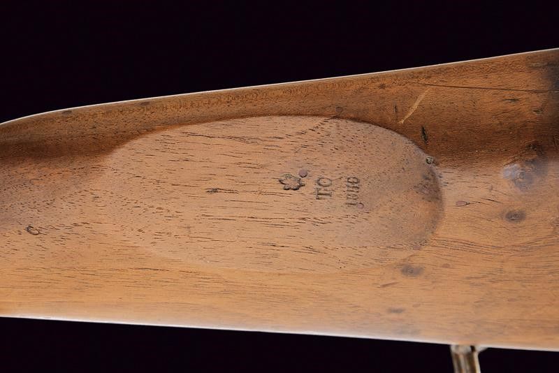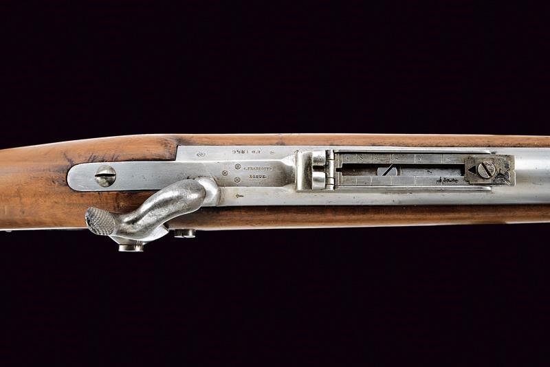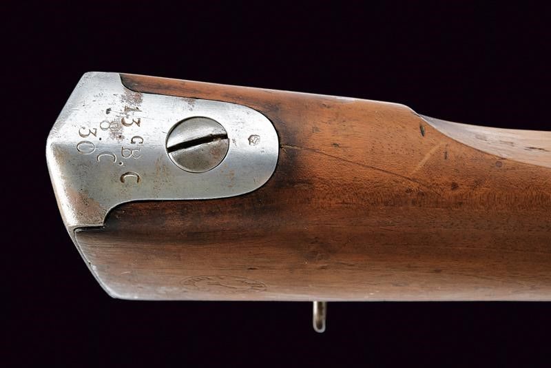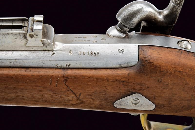 Canna tonda con base ottagonale, rigata (anima con pitting, rigatura non più visibile), con culatta marcata 'FRANCOTTE LIEGE', 'ED 1856', 'A', punzone del banco di prova di Liegi e vari altri punzoni, munita di alzo regolabile fino a '1000' e abbattibile, dotata di guida per la baionetta (marcata '5308'), cal. 17.7 mm. Batteria a molla indietro firmata 'A. FRANCOTTE LIEGE'; cassa intera in legno con fornimenti in ottone e ferro. Il calciolo marcato '13 C.B.C. 8. C 30' e con punzone. La guancia sinistra marcata 'TO 1856'. Bacchetta in ferro. Completa della sua baionetta, la lama marcata 'V.W' e 'C', crociera in ferro marcata '13. B.C. 1.C. 128', con fodero e fornimenti in ottone.