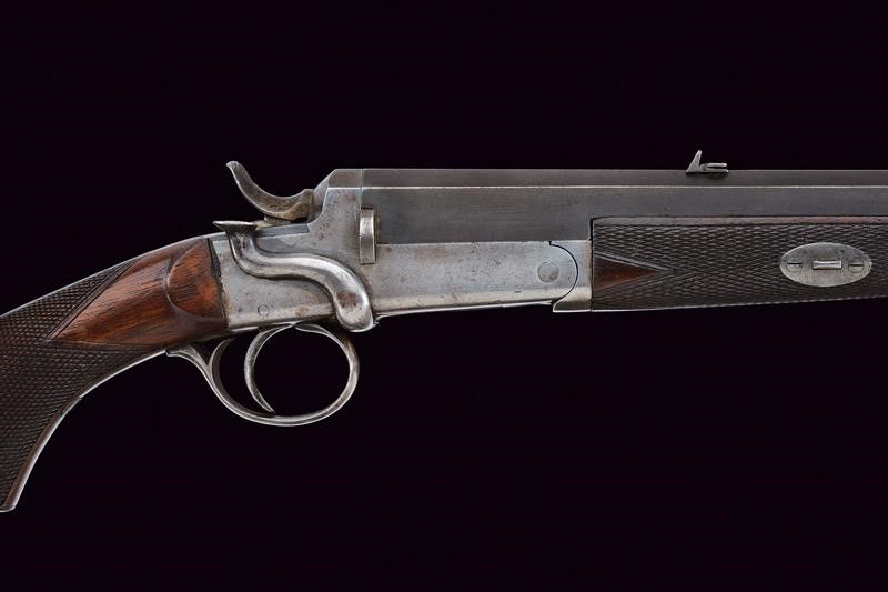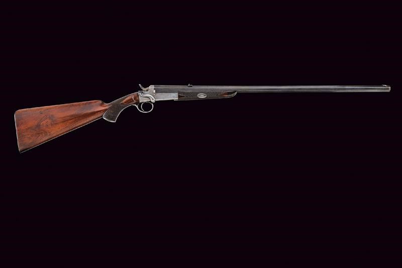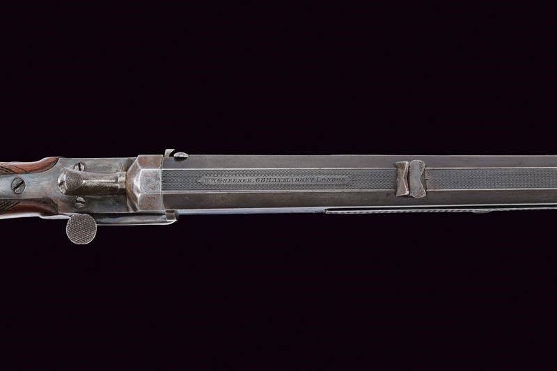 Canna ottagonale rigata, dotata di alzo a due fogliette per '50' e '100' yarde, recante firma al dorso 'W.W. GREENER 68 HAYMARKET LONDON', recante in basso punzoni del banco di Birmingham, cal. 38 in volata. Anima pulita, rigatura visibile, minimi segni d'uso. Castello e bascula in un unico pezzo. Meccanica funzionate. Calcio ed astina in legno, entrambi zigrinati. Fornimenti in ferro con qualche intaccatura. Leva di sblocco per la bascula sul fianco destro. Resti di finitura antica.