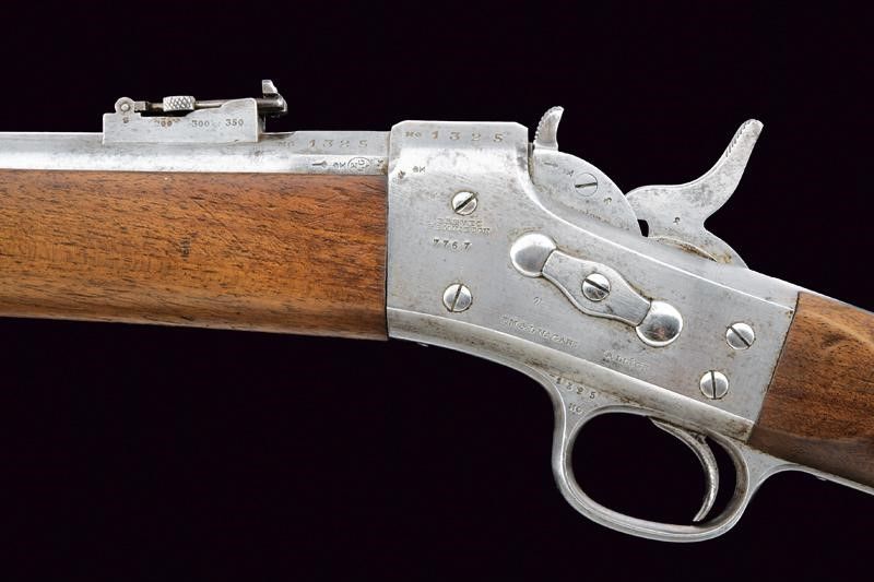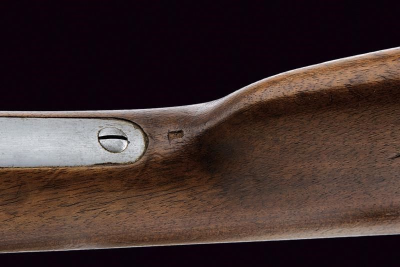 Canna tonda rigata (anima leggermente impolverata con rigatura visibile) con base ottagonale marcata con punzone pontificio, punzone del banco di prova di Liegi, matricola '13xx' e con altri punzoni, dotata di mirino, alzo abbattibile e regolabile, cal. 12 mm. Castello in ferro con marcature 'BREVET REMINGTON' e 'E. M. & L. NAGANT A LIEGE', punzone 'X' sotto corona, 'MG' e vari altri punzoni, matricola '13xx'. Otturatore a blocco rotante recante punzoni e numero di serie coevo alla canna. Meccanica funzionante. Calcio ed astina in legno, ben visibile sul lato destro della pala il timbro 'CATHOLIQUES BELGES' con data '1868'. Fornimenti e bacchetta in ferro.