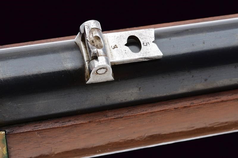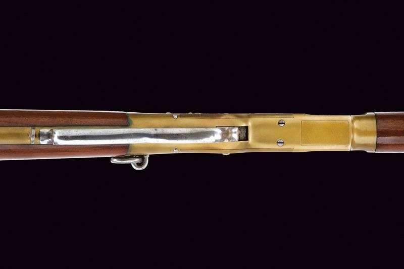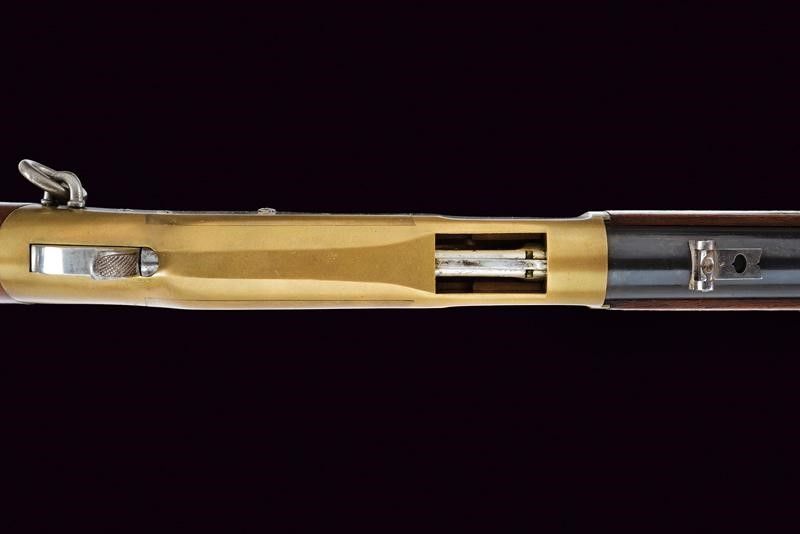 Europa, lunghezza 99,7 cm. Terzo quarto del XIX Secolo Canna cilindrica rigata, priva di marcature, dotata di alzo abbattibile. In volata cal. 42. Castello in ottone senza marcature, sul tipo del secondo modello Winchester 1866. Meccanica funzionante. Calcio ed astina in legno, ben conservati. Caciolo in ottone con sportellino. Due reggicanna in ferro, il secondo dotato di mirino. Anello da sella. Canna e serbatoio conservano l'80% circa della brunitura originale. Probabilmente una produzione di Liegi di altà qualità .