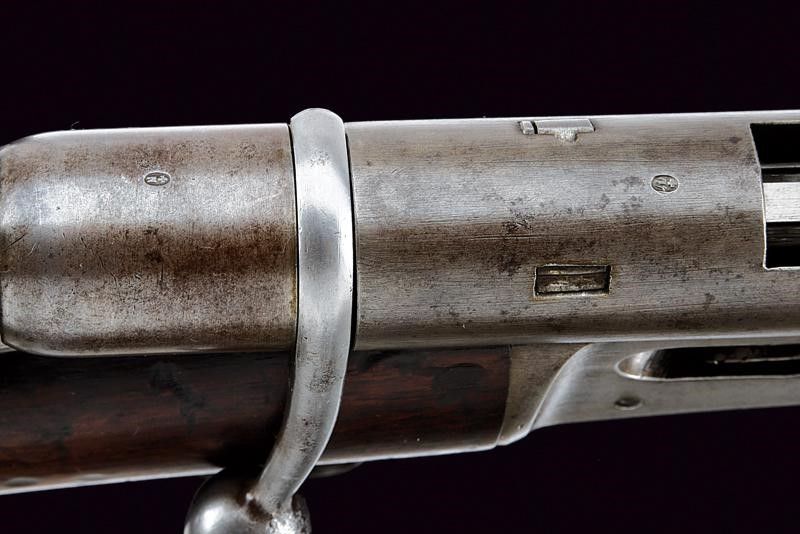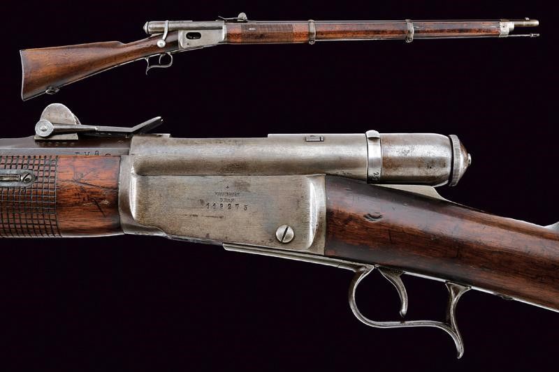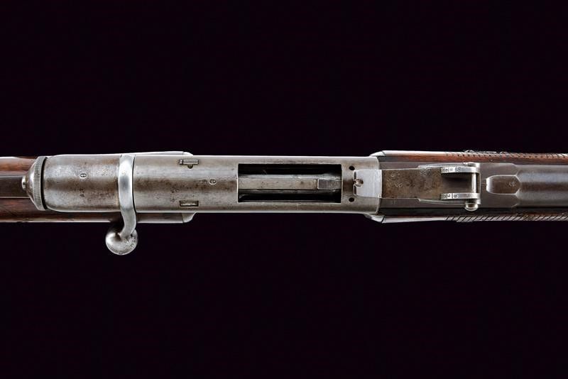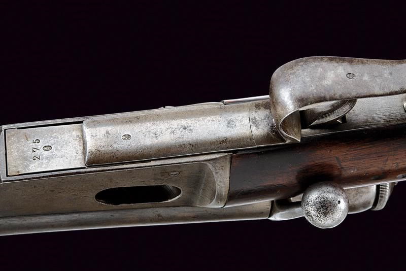 Canna tonda rigata (anima pulita, rigatura ben visibile), con base ottagonale marcata con numero di matricola '119xx', 'W' sotto croce elvetica e con altri punzoni, munita di alzo regolabile, cal. 10,5 mm. Otturatore girevole-scorrevole, castello marcato 'WAFFENFABRIK BERN' sotto croce elvetica e con la stessa matricola. Calcio ed astina in legno, l'astina zigrinata, con timbro. Fornimenti e bacchetta in ferro. Meccanica funzionate.