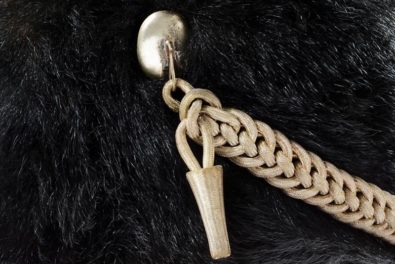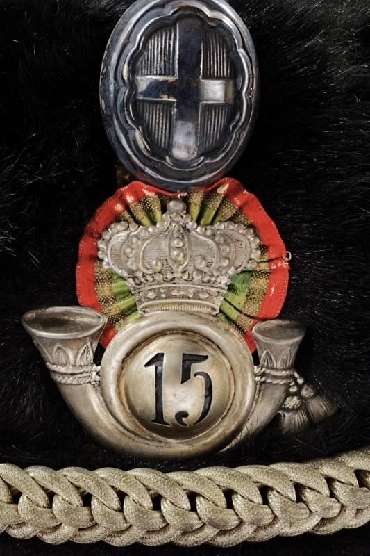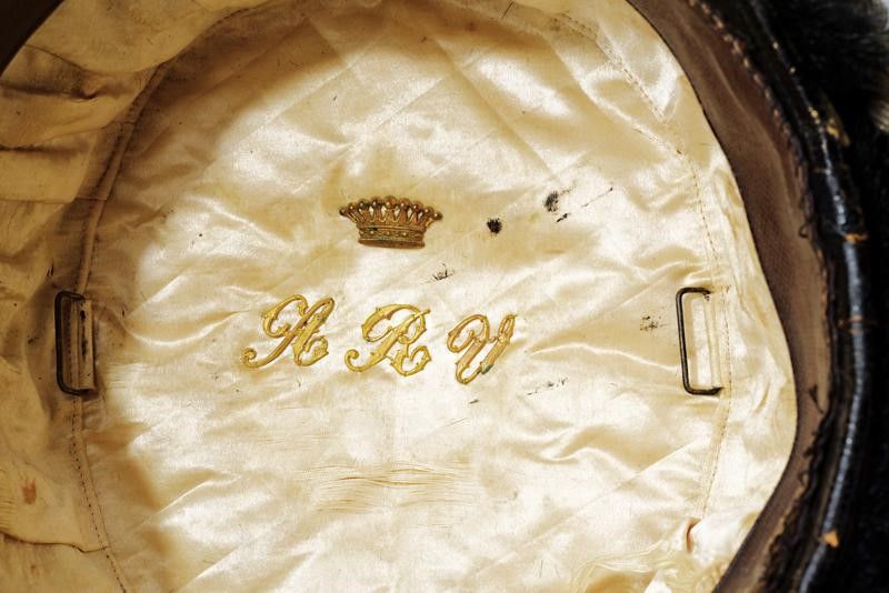 Regno d'Italia, altezza 16 cm. 1890 circa In pelliccia; con fregio anteriore in metallo bianco recante il numero '15', su coccarda tricolore in tessuto; al sommo la nappa metallica con stemma sabaudo. Imperiale in tela verniciata (piccole mancanze). Completo di cordoncino in filo argentato. All'interno fascia in cuoio, la cuffia in seta bianca (forti segni d'usura) e con monogramma del proprietario 'A. R. V.' sotto corona comitale.