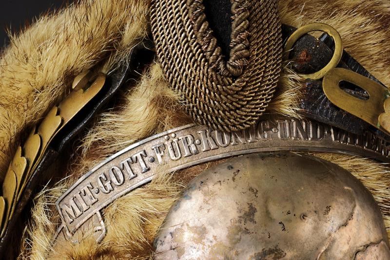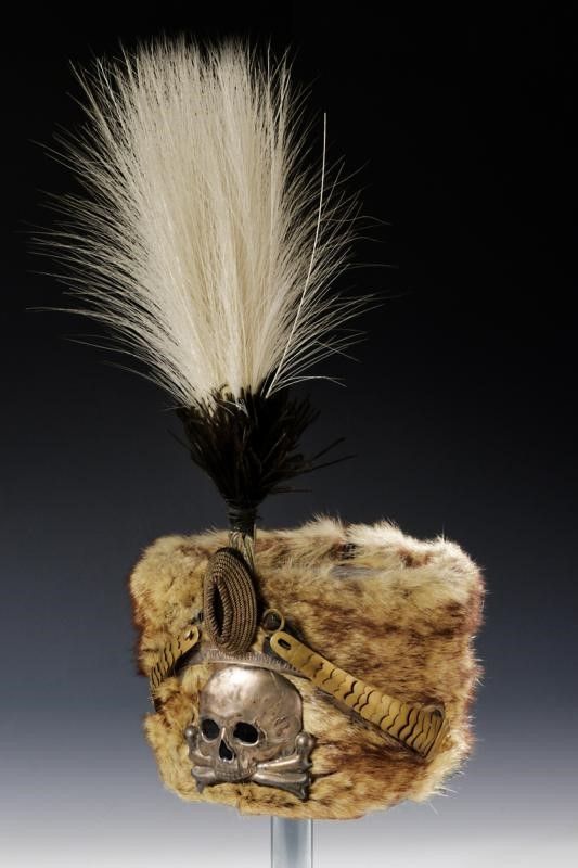 Prussia, altezza 15 cm. 1900 circa Corpo rivestito in pelliccia di opossum, l'imperiale mancante. Fregio frontale a teschio in argento sotto al bandeau 'MIT GOTT FÜR KÖNIG UND VATERLAND'. Completo di coccarda del reich, soggoli a squame convesse, cordatura in canutiglia argentata con profilature nere, feldzeichen in canutiglia argentata e pennacchio con piume di airone. All'interno alluda in pelle. Molto raro.