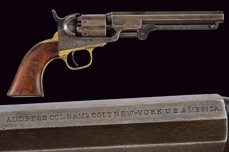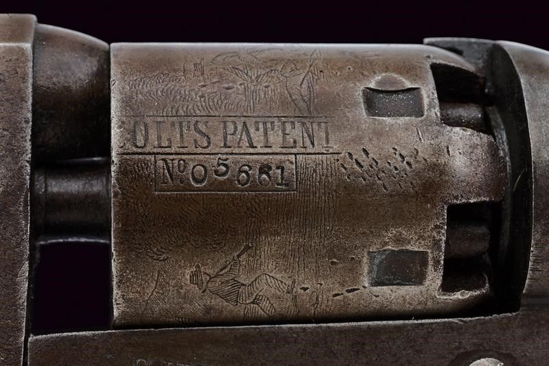 1862 Canna ottagonale da 6', rigata (un po' di pitting all'interno, rigatura visibile), con marcatura 'ADDRESS COL SAM.L COLT NEW-YORK U.S. AMERICA', cal. 31. Fermo della canna sostituito, la sua vite mancante. Tamburo a sei colpi con scena di attacco alla diligenza ben visibile come anche 'COLTS PATENT' e la matricola (parziale e coeva al resto). Meccanica funzionante. Castello con resti d'iscrizione 'COLTS PATENT', matricola '205xxx'. Piccolo difetto alla giunzione di canna e castello. Bande dell'impugnatura in ottone, con lievissime tracce di finitura, matricole coeve al resto. Ponticello del tipo tondeggiante. Qualche leggera traccia di finitura anche sulle parti in ferro. Impugnatura in noce.