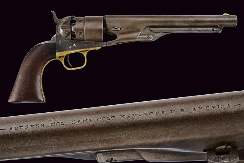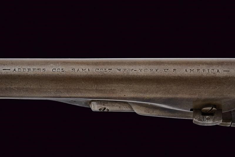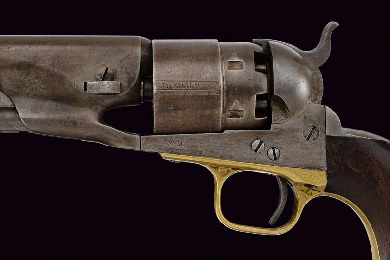 1863 Canna tonda da 8' (anima pulita, con qualche segno d'uso, rigatura visibile), recante al dorso marcatura con indirizzo di New York, sul fianco sinistro il punzone 'T', cal. 44. Tamburo ribassato con tracce di raffigurazione della battaglia navale tra la marina texana e quella messicana, marcatura del brevetto ben visibile e matricola parziale coeva al castello, punzoni 'D'. Meccanica ben funzionante. Il castello a tre viti e con intaglio alla protezione del tamburo per montaggio di un calcio rimovibile (non presente), con matr. '128xxx', marcatura 'COLTS PATENT' sul fianco sinistro. Il ponticello in ottone con matricola coeva e ben visibile, punzone 'D'. Banda dorsale in ferro con matricola coeva e, alla base dell'impugnatura, lo scasso per l'innesto del calcio rimovibile, tracce di punzone 'D' al dorso. Impugnatura in legno con piccoli restauri, il lato sinistro con tassello rettangolare inciso (restauro o resti di timbro?). Forse qualche traccia di tartarugatura al castello e lievi tracce di brunitura alla canna.