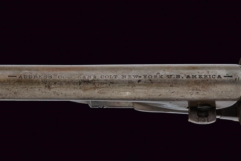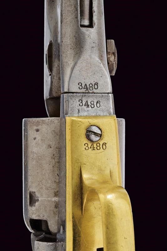 1861 Canna cilindrica da 7-1/2', rigata (rigatura visibile, qualche intaccatura all'interno), recante al dorso marcatura standard, cal. 36. Il fermo della canna con numeri non coevi al resto dei componenti. Tamburo a sei colpi con lievissime tracce di battaglia fra flotta texana e messicana, meglio visibile il brevetto e i numeri di serie (coevi agli altri componenti). Meccanica funzionante. Castello con marcatura 'COLTS PATENT' sul fianco sinistro, matricola '34xx' presente anche sul perno del tamburo (la medesima numerazione è presente su canna, tamburo, e bande dell'impugnatura). Il ponticello con dicitura '36 CAL'. Bande in ottone. Qualche intaccatura. Impugnatura in noce.