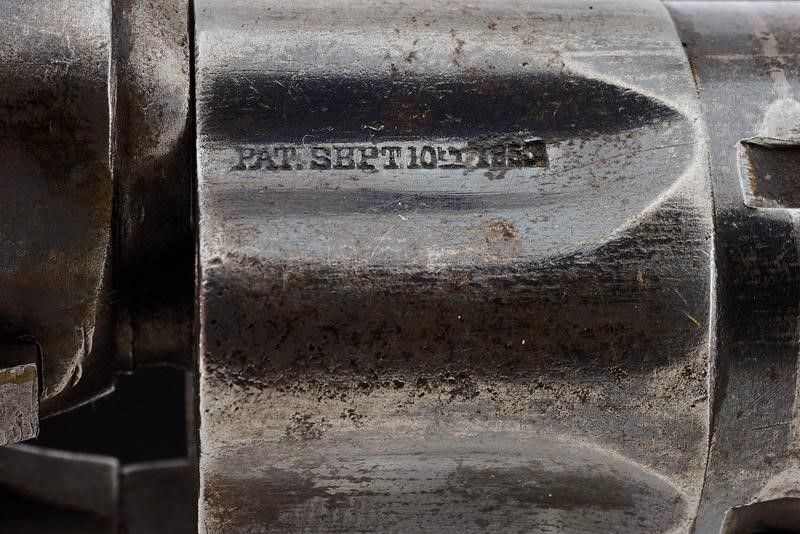 1862 Canna tonda da 6-1/2' rigata (lievi intaccature all'interno, rigatura visibile) con marcatura dorsale standard, mirino a vela brunito, cal. 36. Matricola coeva al castello, il fermo con matricola parziale coeva. Tamburo del tipo sgusciato e ribassato, a cinque colpi, recante resti di marcatura del brevetto. Meccanica funzionante. Castello marcato 'COLTS PATENT', con matricola '11xxx'. Bande dell'impugnatura in ottone entrambe con numerazione coeva. Resti di argentatura all'impugnatura. Resti (circa il 20%) di brunitura su canna e tamburo, il castello con lievi tracce di tartarugatura. Qualche intaccatura. Impugnatura liscia in noce.