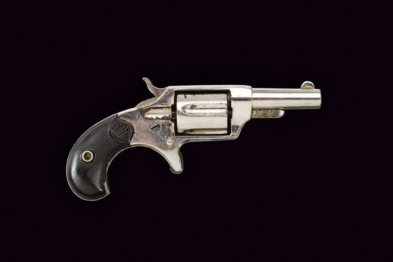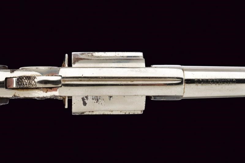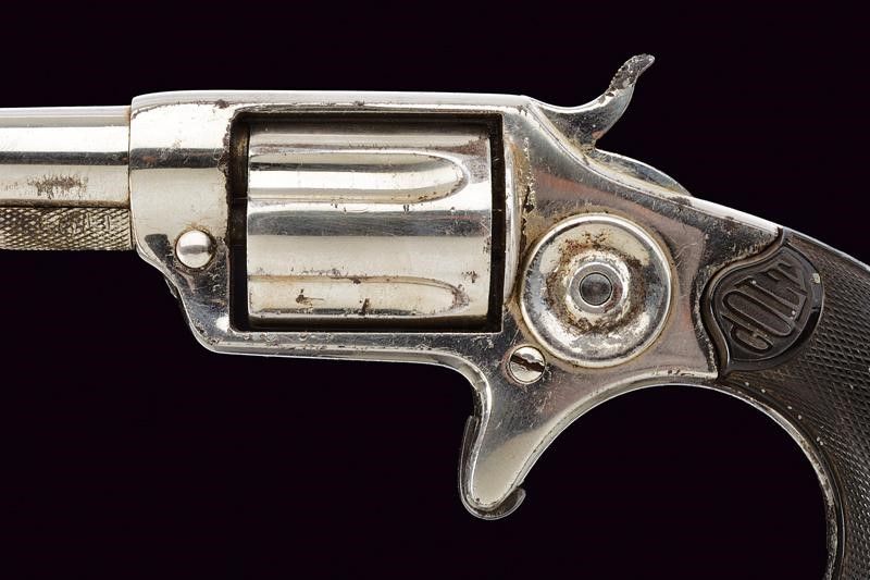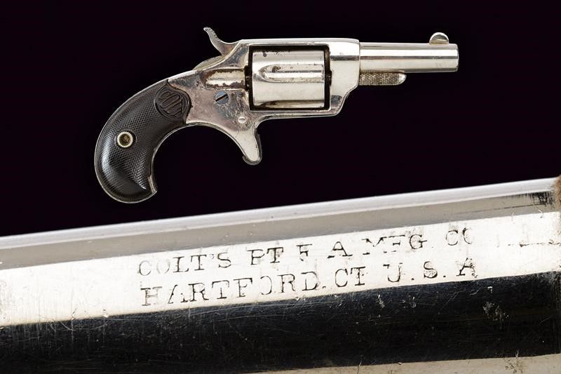 1873 - 1884 Canna tonda rigata (anima con segni d'uso, rigatura visibile) recante resti di marcatura della ditta. Cal. 32 centerfire. Tamburo a cinque colpi. Castello con grilletto a sprone. Guancette in gommadura zigrinata con marchio 'COLT'. Meccanica funzionante. Segni d'uso e del tempo. Nichelatura con qualche intaccatura.