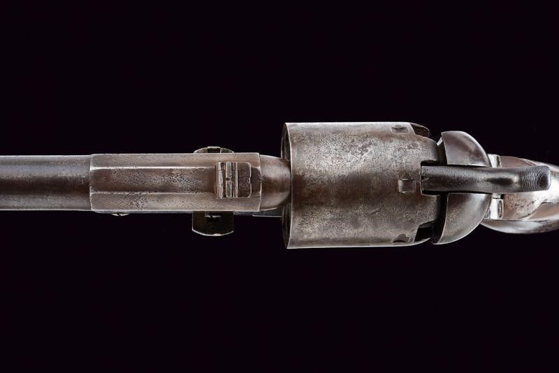 1858 Canna cilindrica da 7-1/2' (qualche incrostazione e intaccatura all'interno, rigatura ben visibile) con base ottagonale, dotata di mirino a semicerchio color argento, marcatura dorsale mancante, cal. 44. Al dorso, vicino alla culatta alzo con foglietta abbattibile. Il calcatoio con matricola parziale a quattro cifre coeva alla canna. Fermo della canna non numerato. Tamburo liscio a sei colpi con tacche rettangolari, privo di marcature o decorazioni (due camere leggermente deformate, sostituito?). Meccanica funzionante. Castello marcato 'COLTS PATENT' e 'U.S.' con matricola '16xxx' coeva alla canna; Il perno centrale del tamburo senza numeri. Banda inferiore e ponticello (del tipo arrotondato) in ottone con matricola coeva al castello, recante anche il punzone 'L'. Banda dorsale in ferro con matricola coeva sotto all'impugnatura. Presenta attacchi sui fianchi e scasso sotto all'impugnatura per il montaggio di un calcio rimovibile (non presente). Varie zone di pitting. Impugnatura liscia in noce senza timbri.