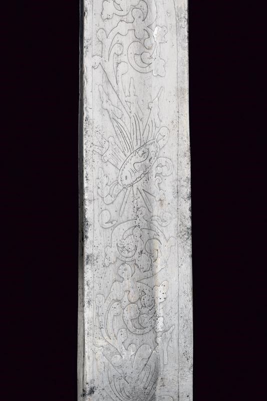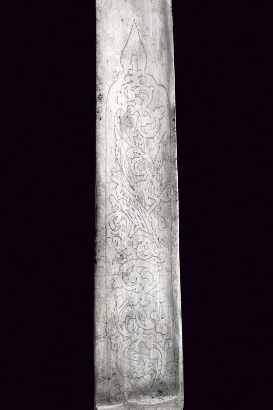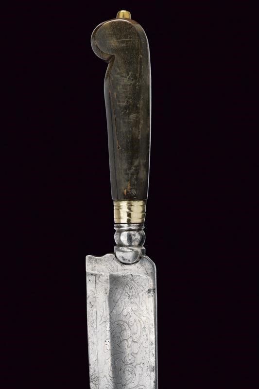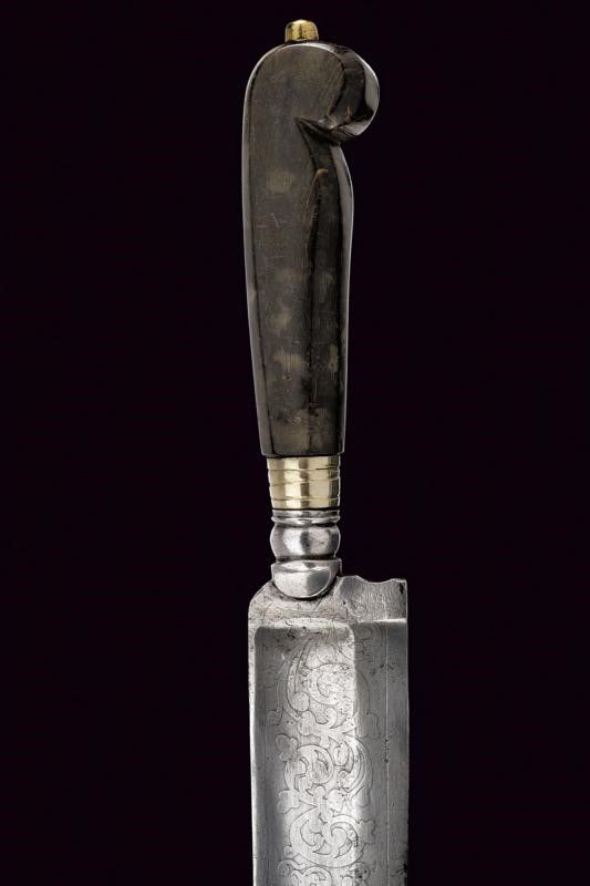 Italia meridionale, lunghezza 50 cm. Larga lama dritta a un filo e controfilo con ampio sguscio, incisa all'acquaforte per più di metà , a trofei e a motivi floreali. Impugnatura faccettata in corno marrone (piccole mancanze e crepa). Ghiera in metallo bianco. Fodero in cuoio con gancio in metallo, puntale mancante.