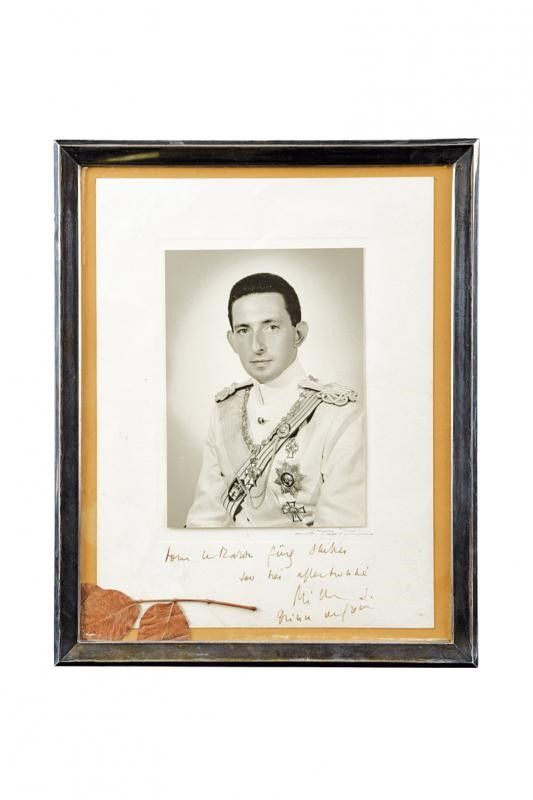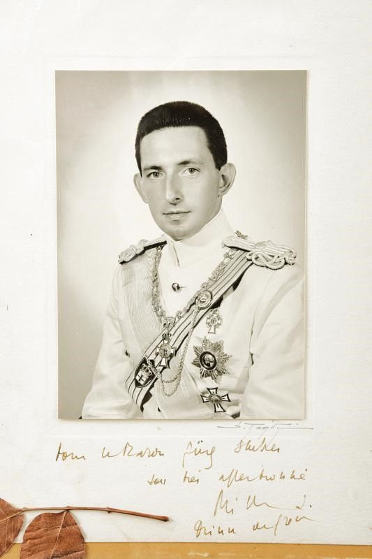Grecia, dimensioni 25 x 31 cm. 1963 Foto di Costantino, all'epoca ancora Principe, ritratto in uniforme bianca con decorazioni. In basso un testo poco leggibile. La foto firmata dal fotografo. Sul retro un'iscrizione in lingua tedesca traducibile: 'Ricevuto dal Principe dalla mia visita a Ekali 1963'. Il principe venne incoronato Re l'anno successivo. In cornice e sotto vetro.