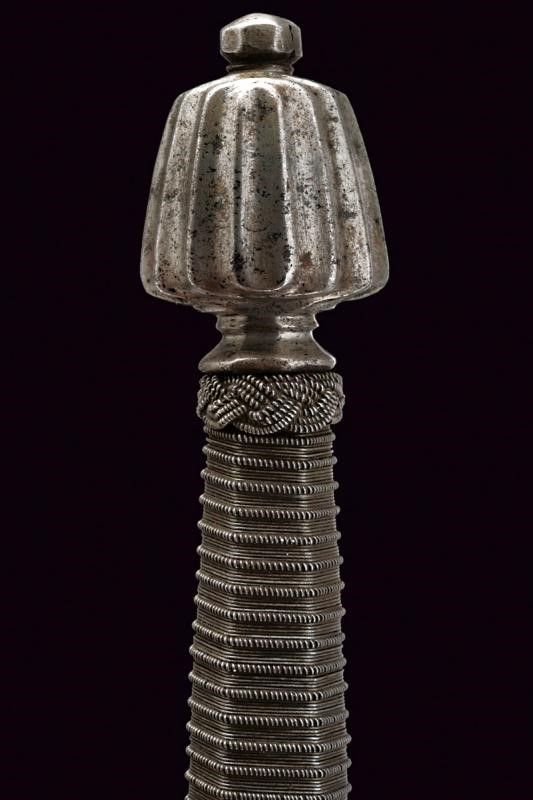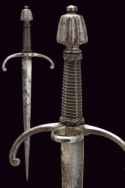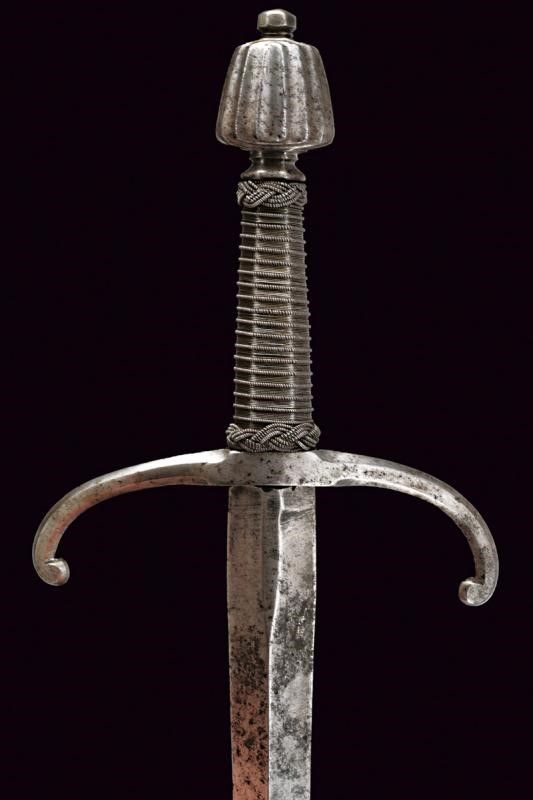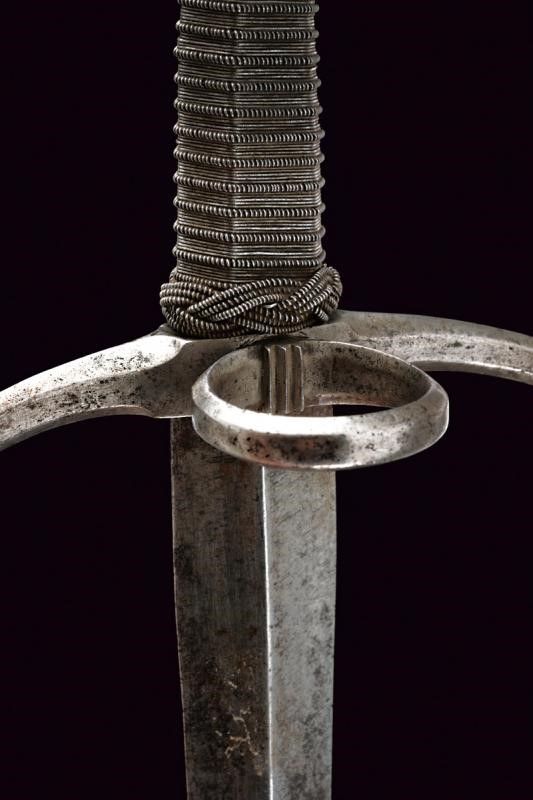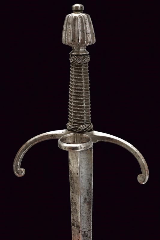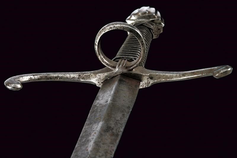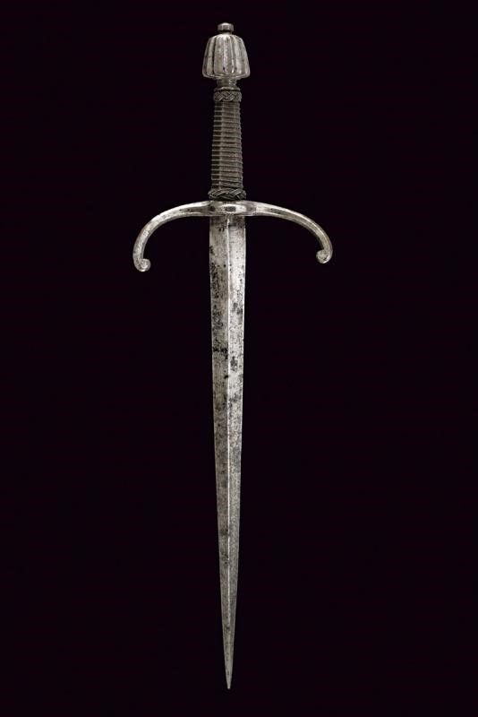 Italia, lunghezza 49 cm. 1600 circa Robusta lama dritta a due fili di sezione a losanga, piatta alla base sul lato posteriore. Fornimento in ferro; elso con bracci incurvati verso il basso e leggermente rilevati sul piano di lama, dotati di testa lobata; massello con anello di parata, pomo a tino scanalato. Impugnatura in legno rivestita con trecciola e dotata di teste di moro, in filo di ferro.