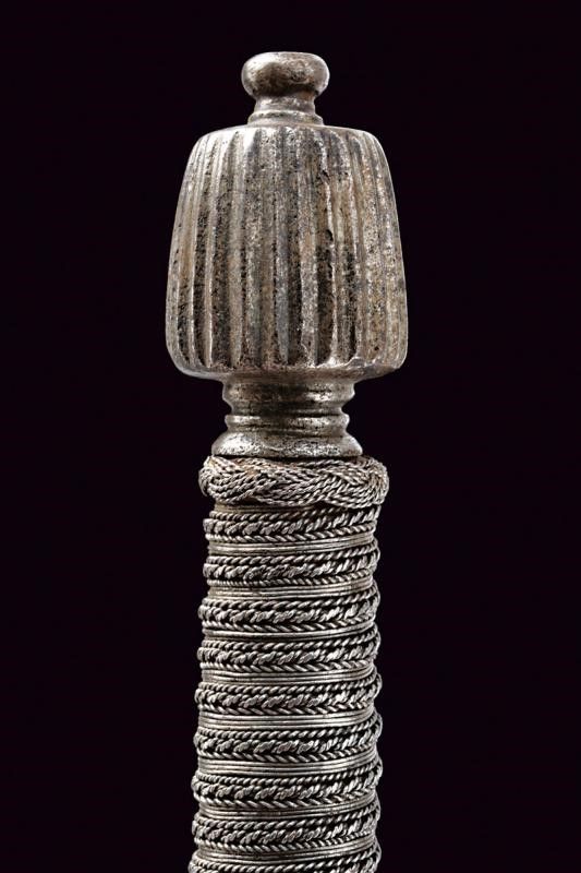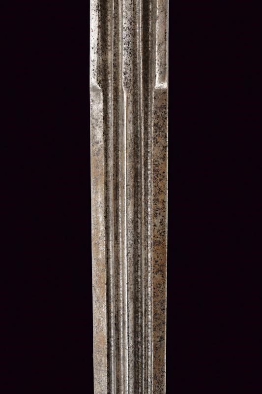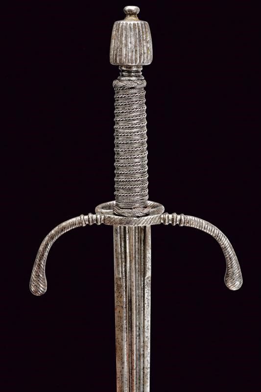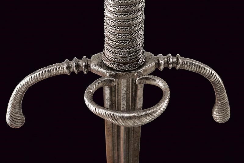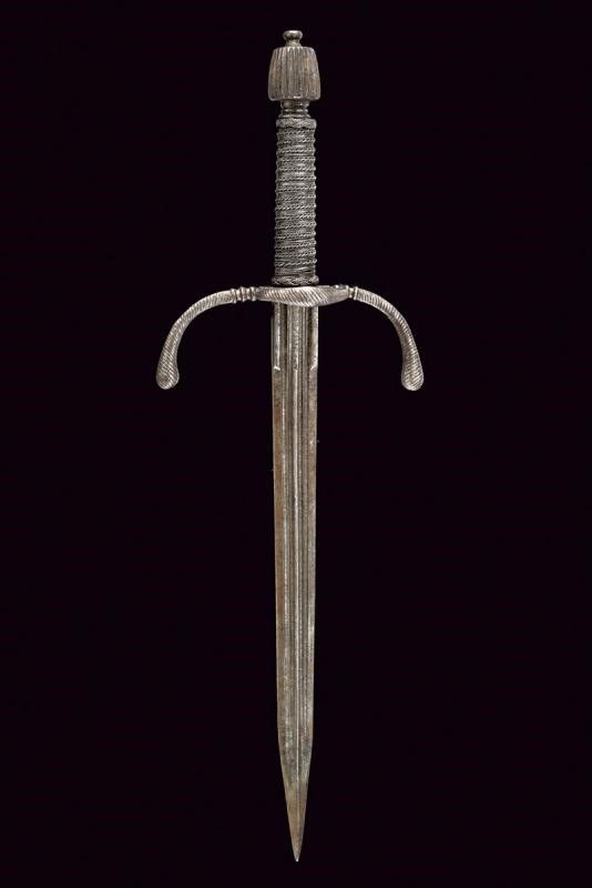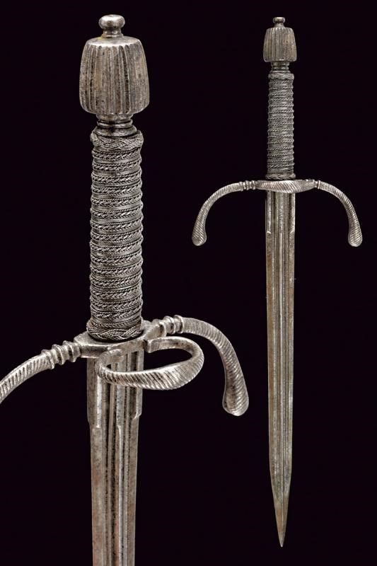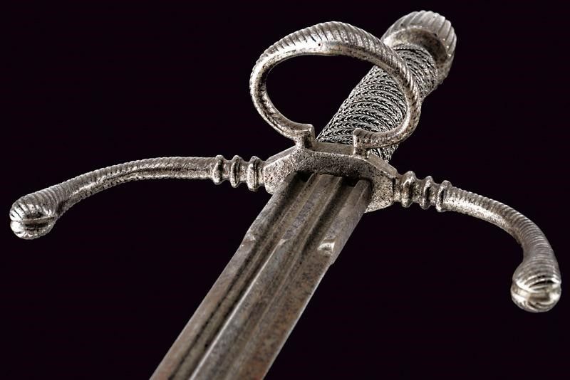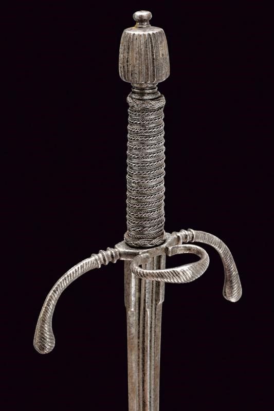 Germania, lunghezza 43.5 cm. 1600 circa Lama dritta a due fili munita di nervature e scanalature, il tallone lavorato en suite. Elso con bracci incisi ed incurvati verso la lame e con estremità a goccia. L'anello di parata decorato nello stesso modo. Pomo a scanalature longitudinali, impugnatura in legno rivestito di trecciola e teste di moro in filo di ferro (probabilmente di epoca successiva).