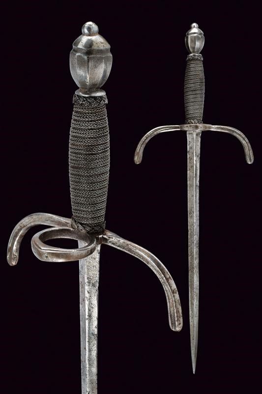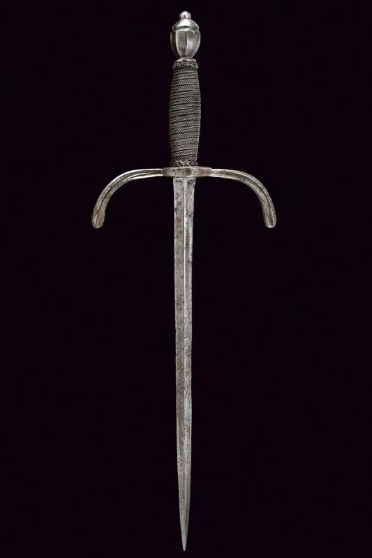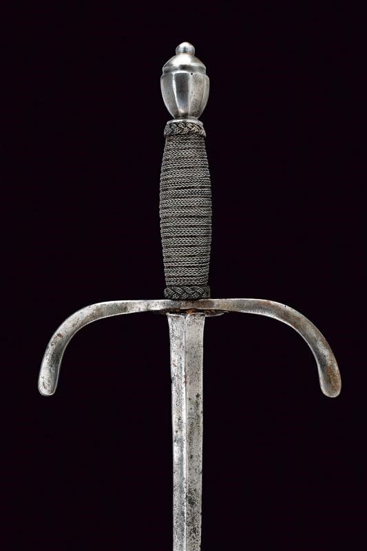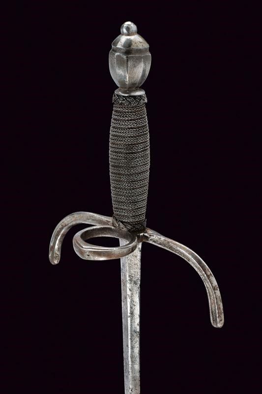 Germania, lunghezza 40.5 cm. XVII Secolo Lama dritta di sezione a losanga. Fornimento in ferro con bracci dell'elso incurvati verso la lama, scanalati su tutta la lunghezza. Pomo a urna faccettata. Impugnatura in legno rivestita con trecciola e dotata di teste di moro in filo di ferro.